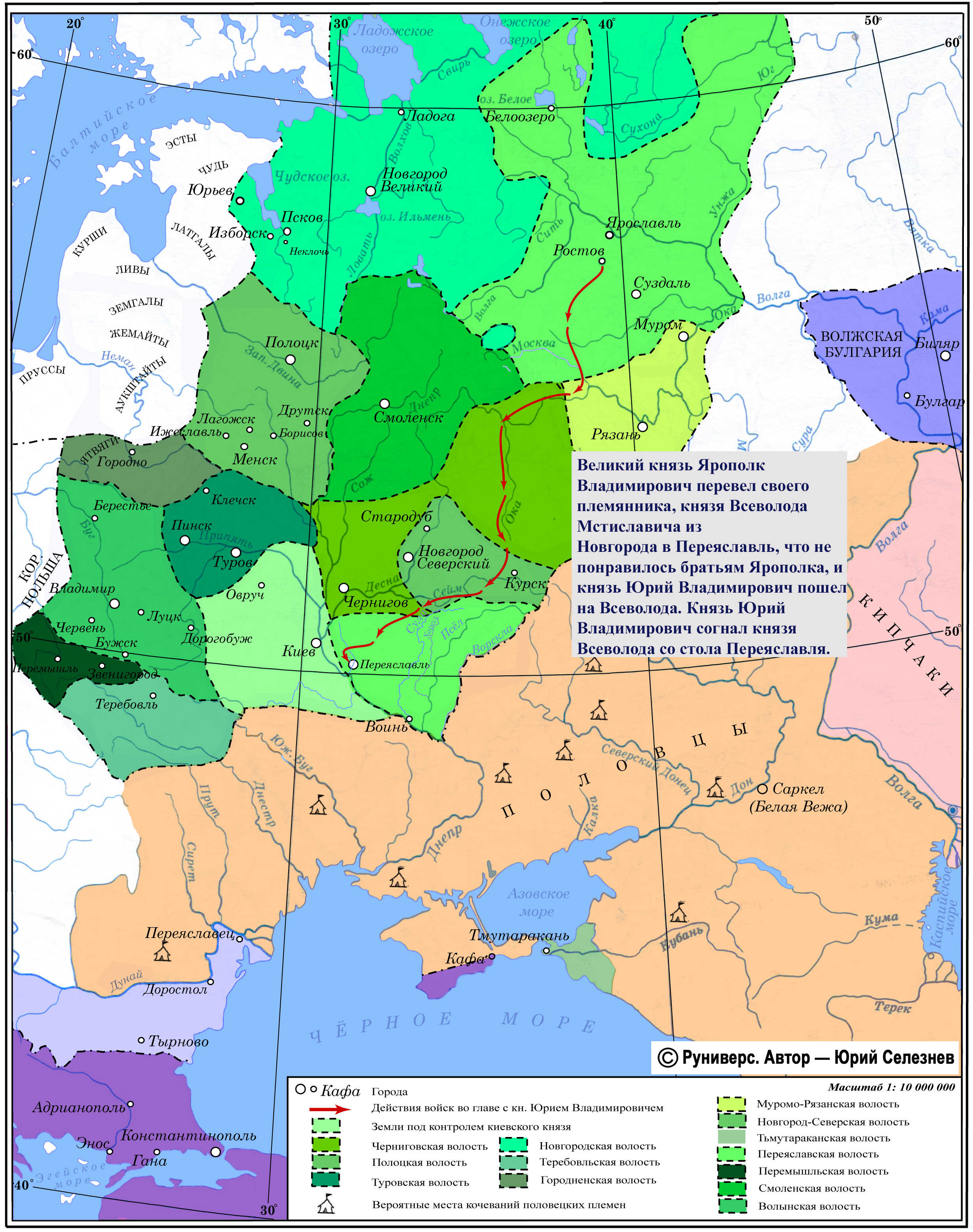 Великий князь Ярополк Владимирович перевел своего племянника, князя Всеволода Мстиславича из Новгорода в Переяславль, что не понравилось братьям Ярополка, и князь Юрий Владимирович пошел на Всеволода. Князь Юрий Владимирович согнал князя Всеволода со стола Переяславля