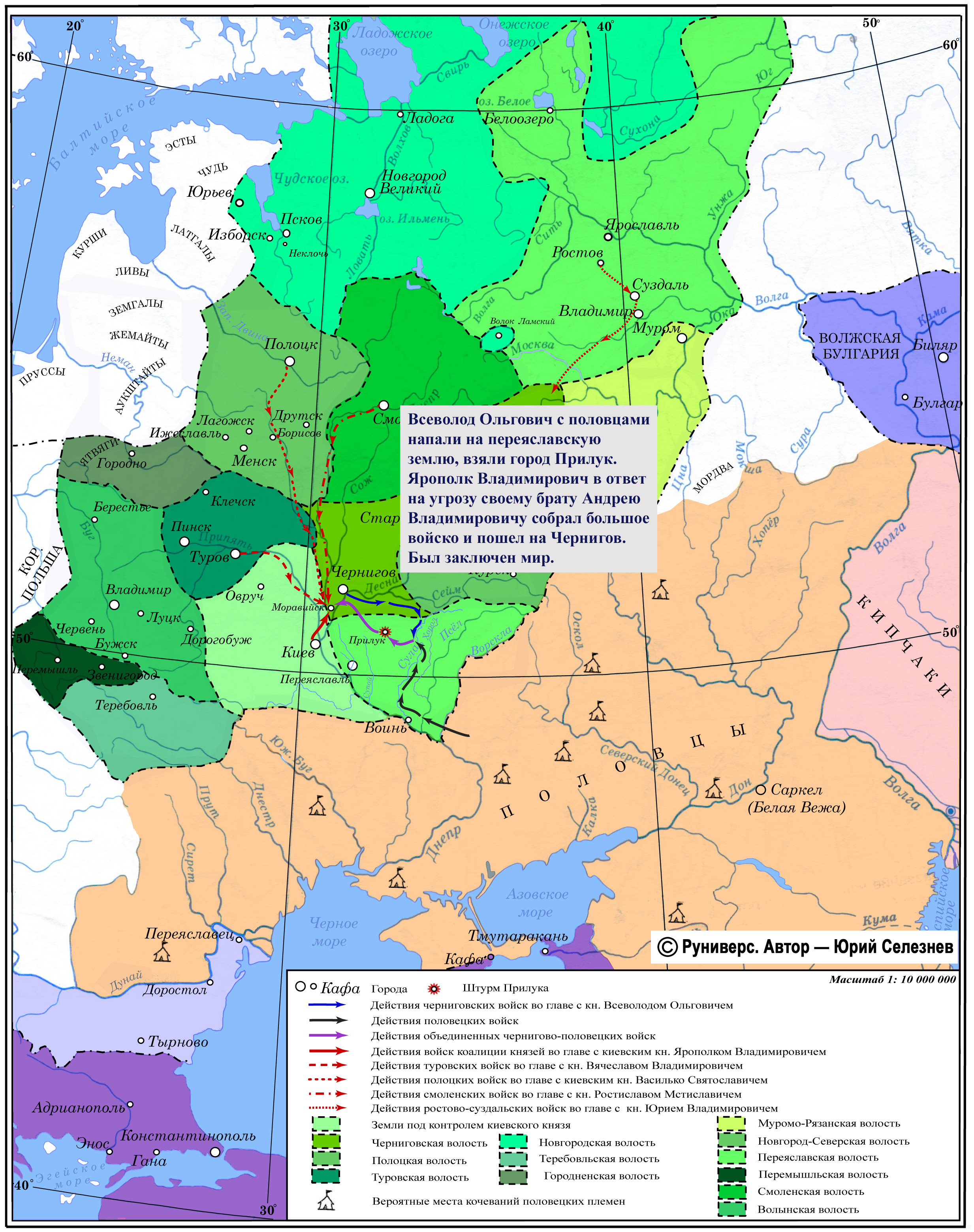 Всеволод Ольгович с половцами напали на переяславскую землю, взяли город Прилук. Ярополк Владимирович в ответ на угрозу своему брату Андрею Владимировичу собрал большое войско и пошел на Чернигов. Был заключен мир.