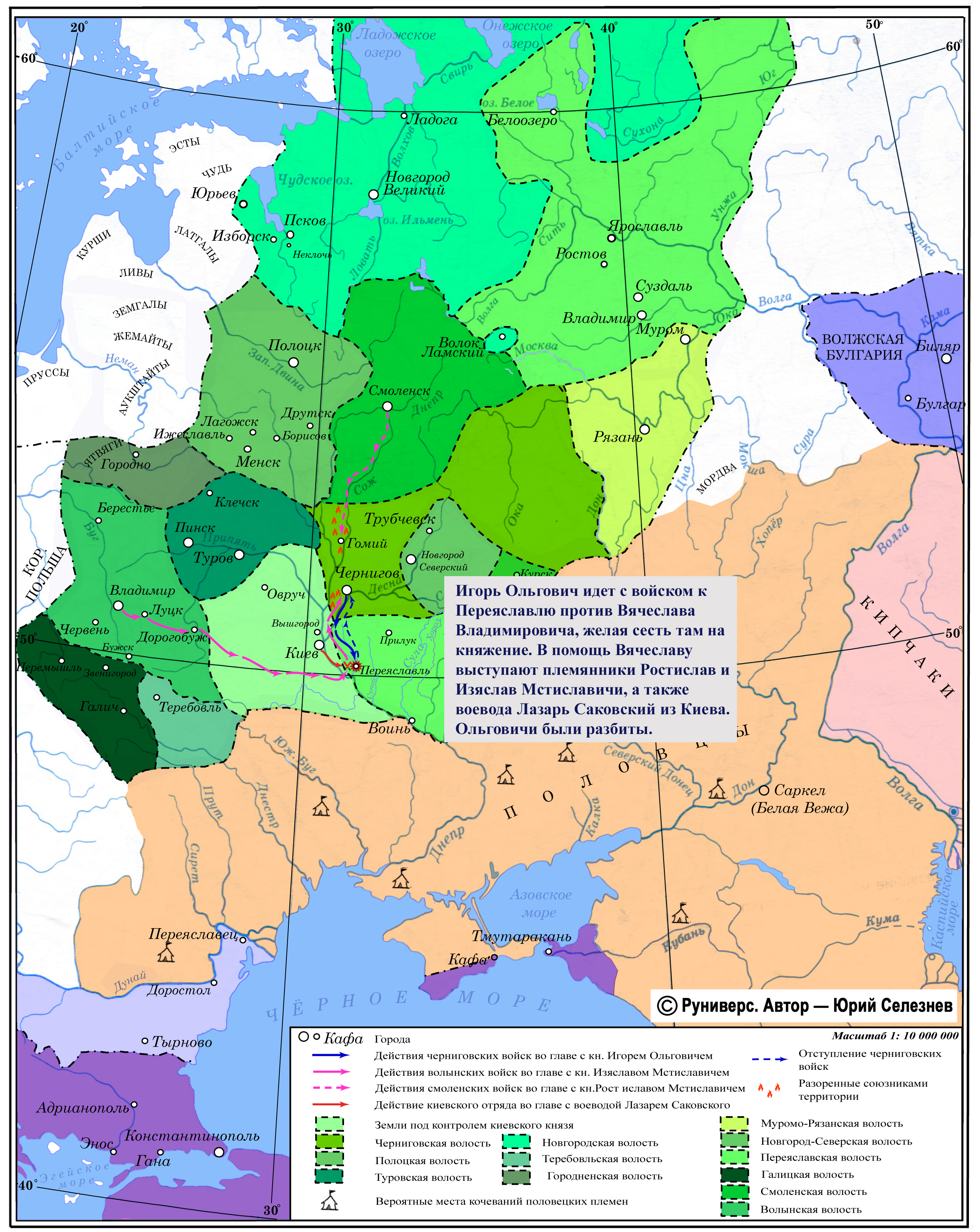 Игорь Ольгович идет с войском к Переяславлю против Вячеслава Владимировича, желая сесть там на княжение. В помощь Вячеславу выступают племянники Ростислав и Изяслав Мстиславичи, а также воевода Лазарь Саковский из Киева. Ольговичи были разбиты.