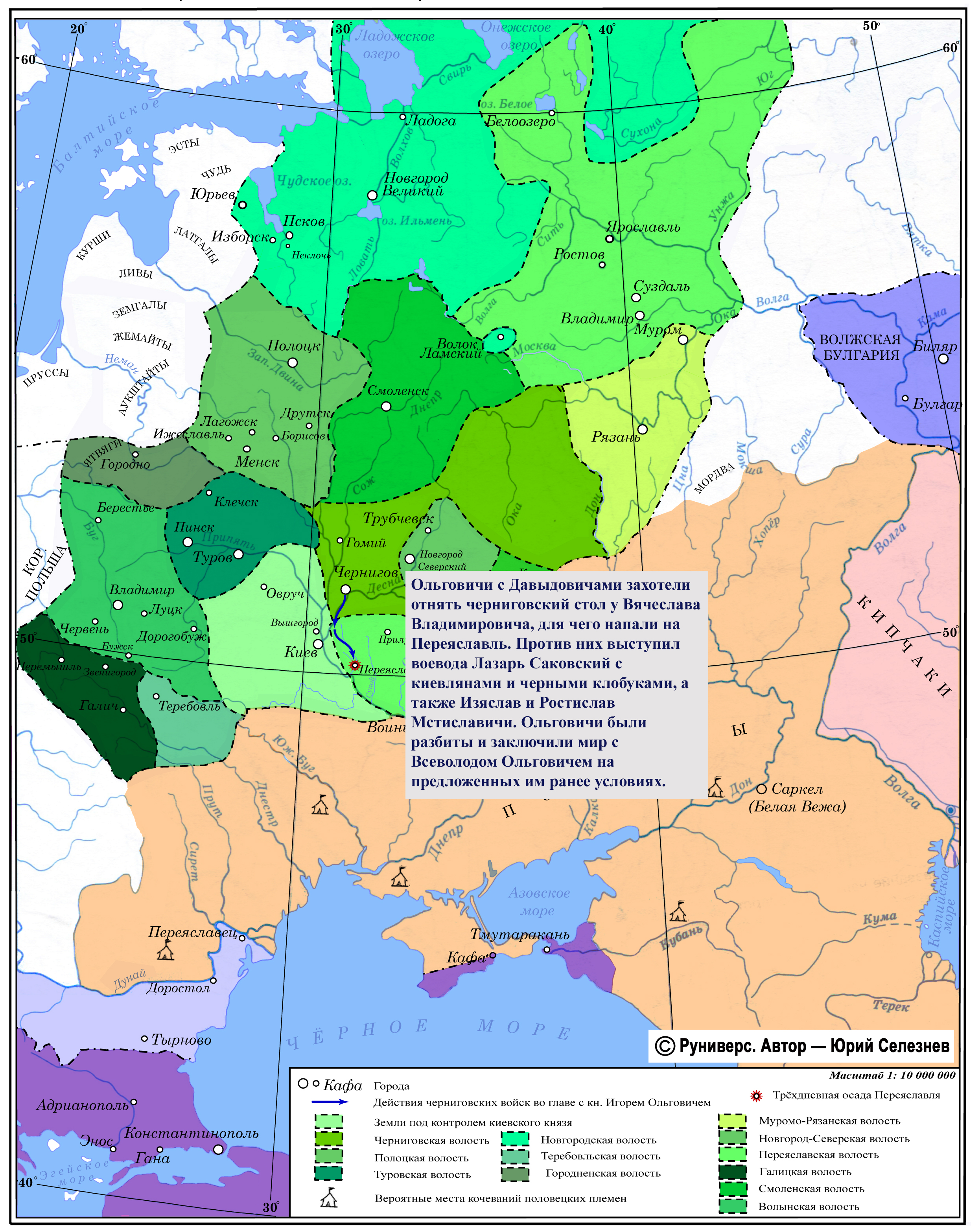 Ольговичи с Давыдовичами захотели отнять черниговский стол у Вячеслава Владимировича, для чего напали на Переяславль. Против них выступил воевода Лазарь Саковский с киевлянами и черными клобуками, а также Изяслав и Ростислав Мстиславичи. Ольговичи были разбиты и заключили мир с Всеволодом Ольговичем на предложенных им ранее условиях.
