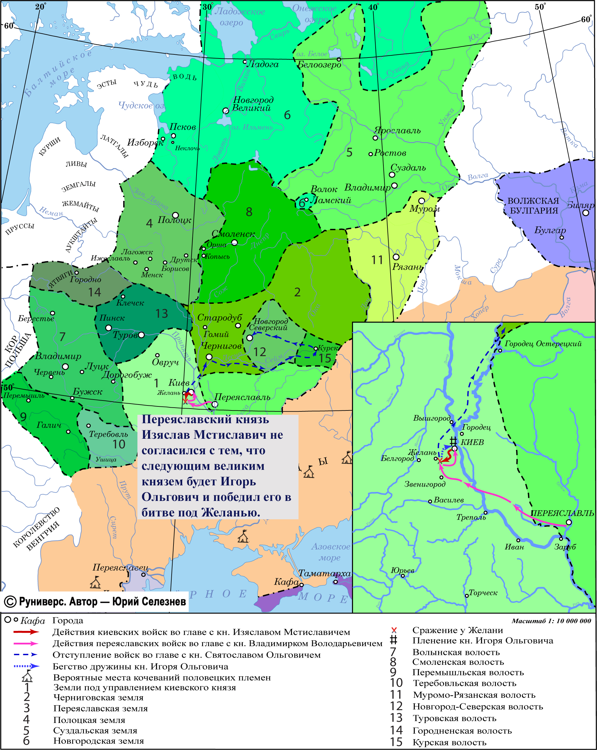 Переяславский князь Изяслав Мстиславич не согласился с тем, что следующим великим князем будет Игорь Ольгович и победил его в битве под Желанью.