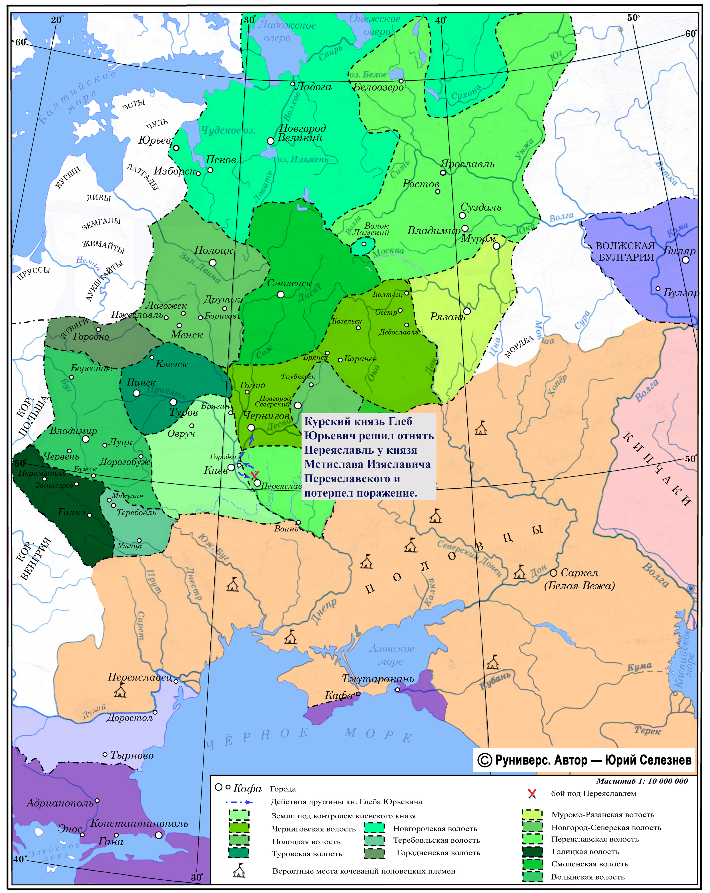 Курский князь Глеб Юрьевич решил отнять Переяславль у князя Мстислава Изяславича Переяславского и потерпел поражение.