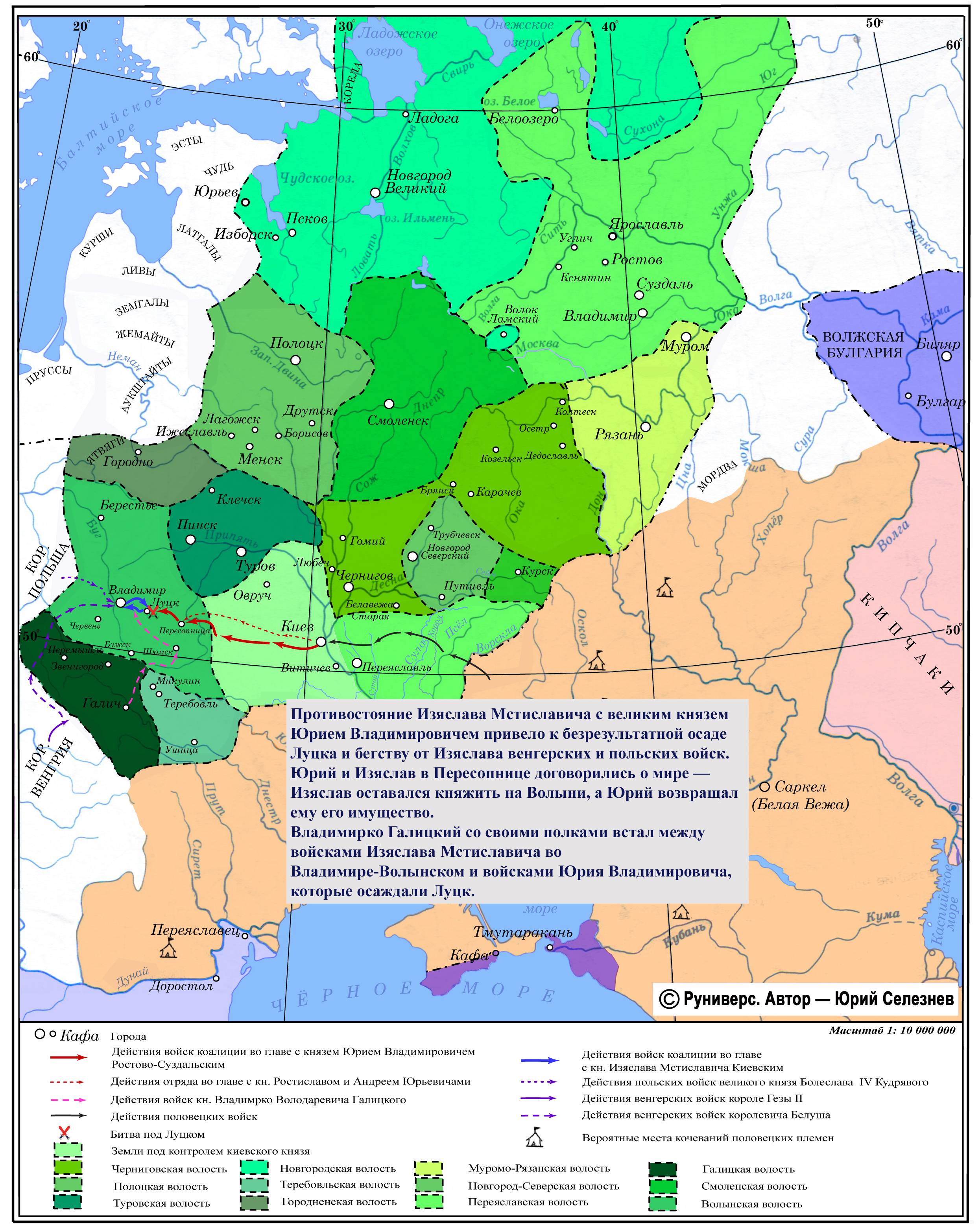 Противостояние Изяслава Мстиславича с великим князем Юрием Владимировичем привело к безрезультатной осаде Луцка и бегству от Изяслава венгерских и польских войск. Юрий и Изяслав в Пересопнице договорились о мире — Изяслав оставался княжить на Волыни, а Юрий возвращал ему его имущество.Владимирко Галицкий со своими полками встал между войсками Изяслава Мстиславича во Владимире-Волынском и войсками Юрия Владимировича, которые осаждали Луцк.