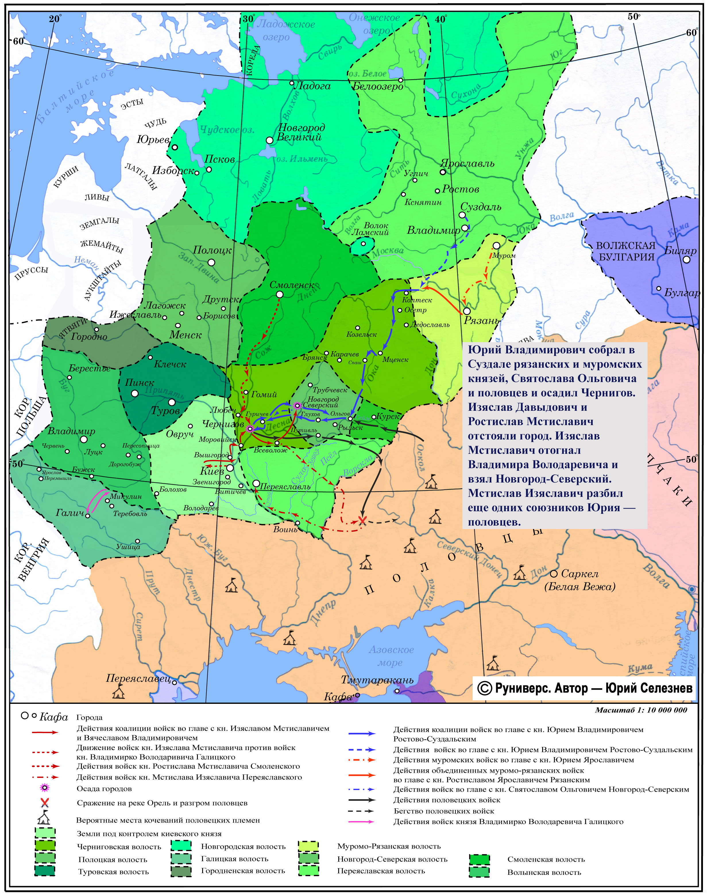 Юрий Владимирович собрал в Суздале рязанских и муромских князей, Святослава Ольговича и половцев и осадил Чернигов. Изяслав Давыдович и Ростислав Мстиславич отстояли город. Изяслав Мстиславич отогнал Владимира Володаревича и взял Новгород-Северский. Мстислав Изяславич разбил еще одних союзников Юрия — половцев.