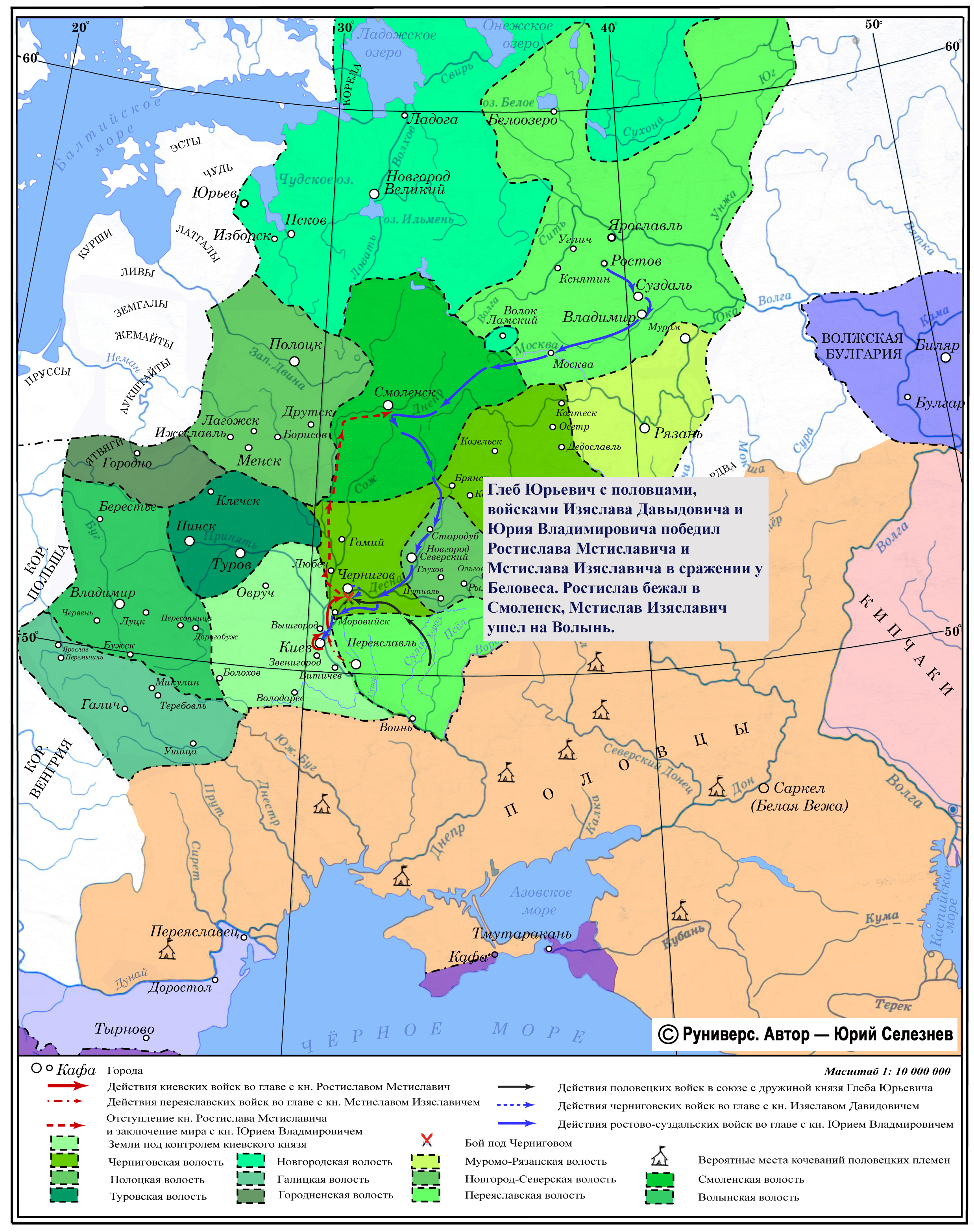 Глеб Юрьевич с половцами, войсками Изяслава Давыдовича и Юрия Владимировича победил Ростислава Мстиславича и Мстислава Изяславича в сражении у Беловеса. Ростислав бежал в Смоленск, Мстислав Изяславич ушел на Волынь.