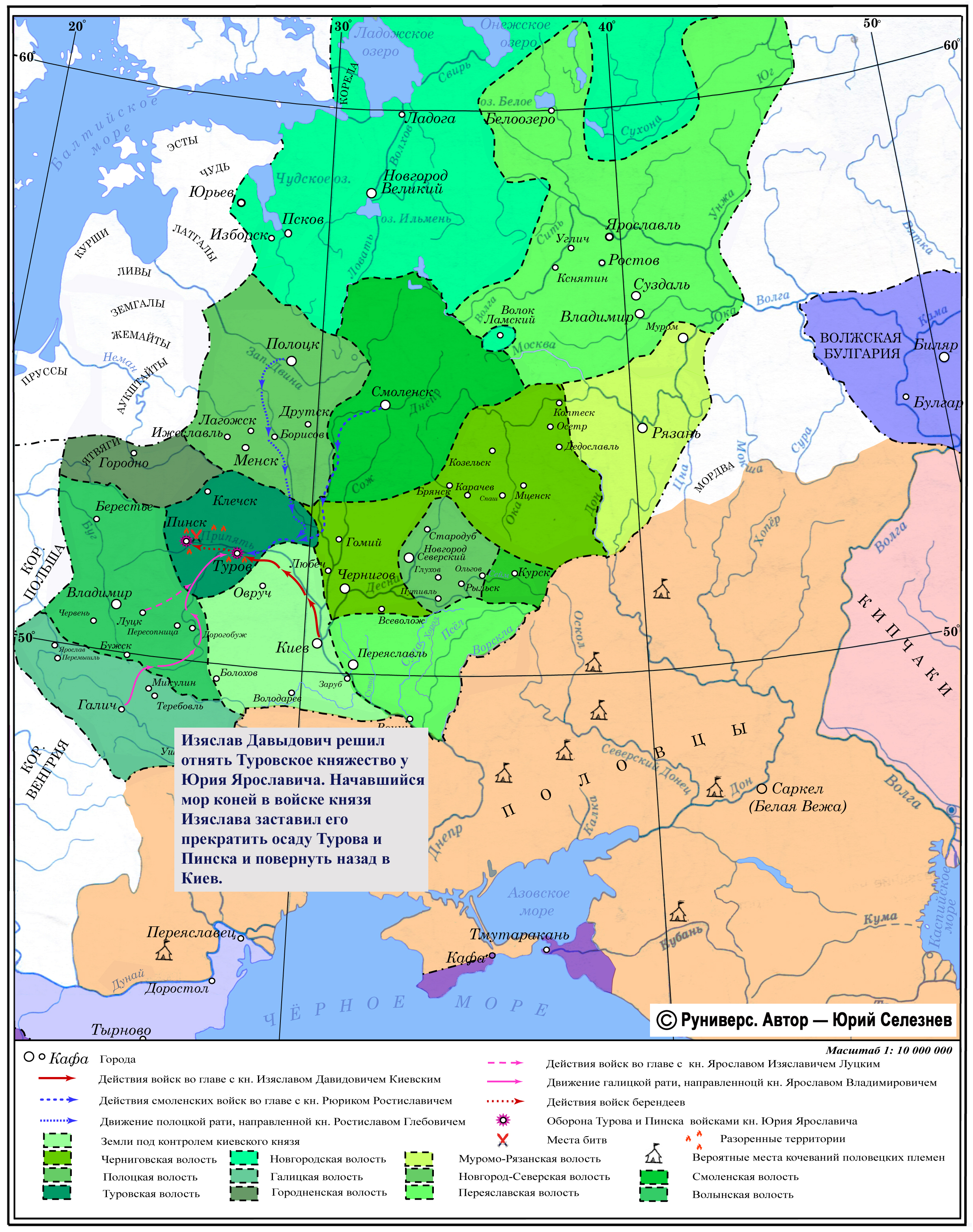 Изяслав Давыдович решил отнять Туровское княжество у Юрия Ярославича. Начавшийся мор коней в войске князя Изяслава заставил его прекратить осаду Турова и Пинска и повернуть назад в Киев.