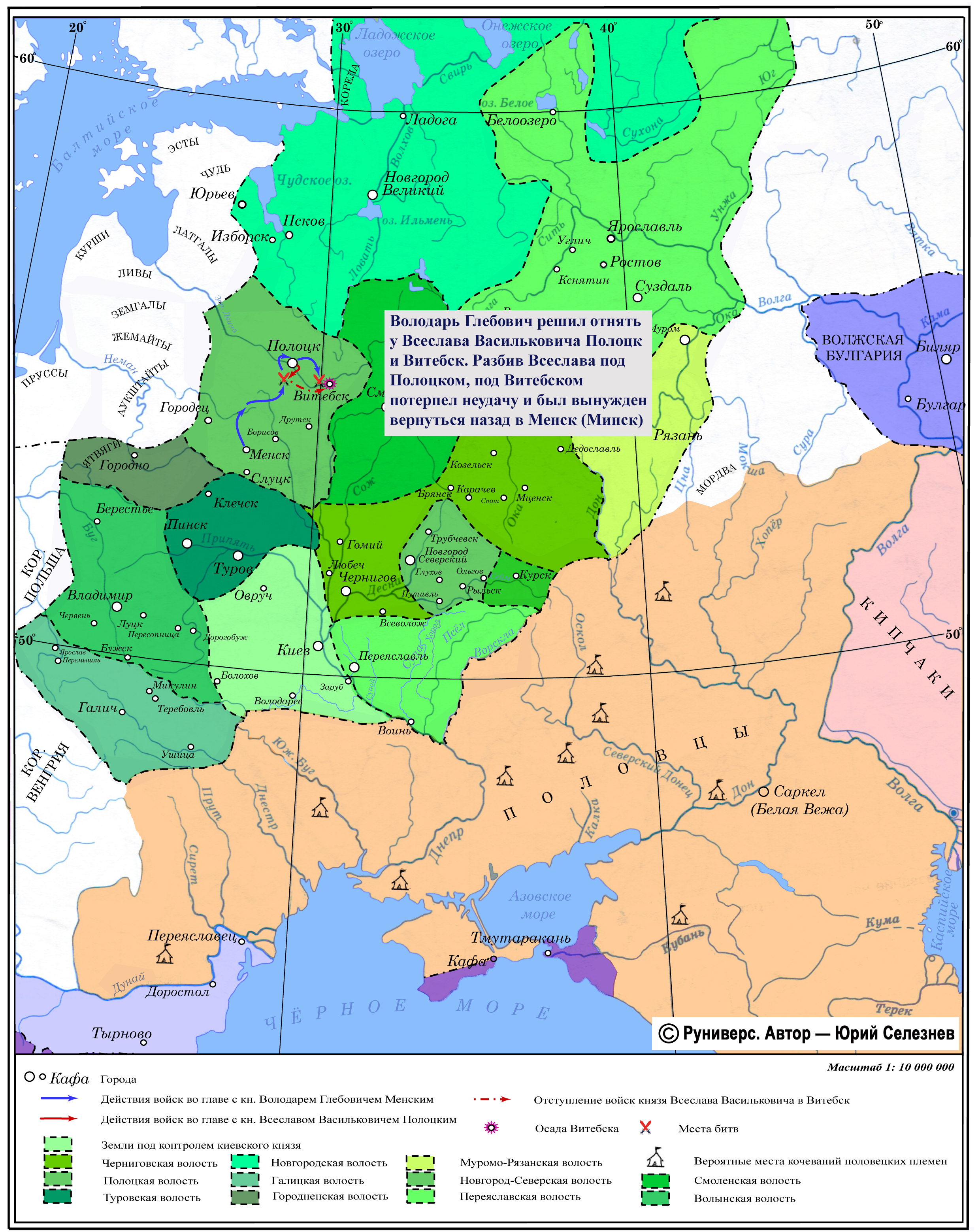 Володарь Глебович решил отнять у Всеслава Васильковича Полоцк и Витебск. Разбив Всеслава под Полоцком, под Витебском потерпел неудачу и был вынужден вернуться назад в Менск (Минск).