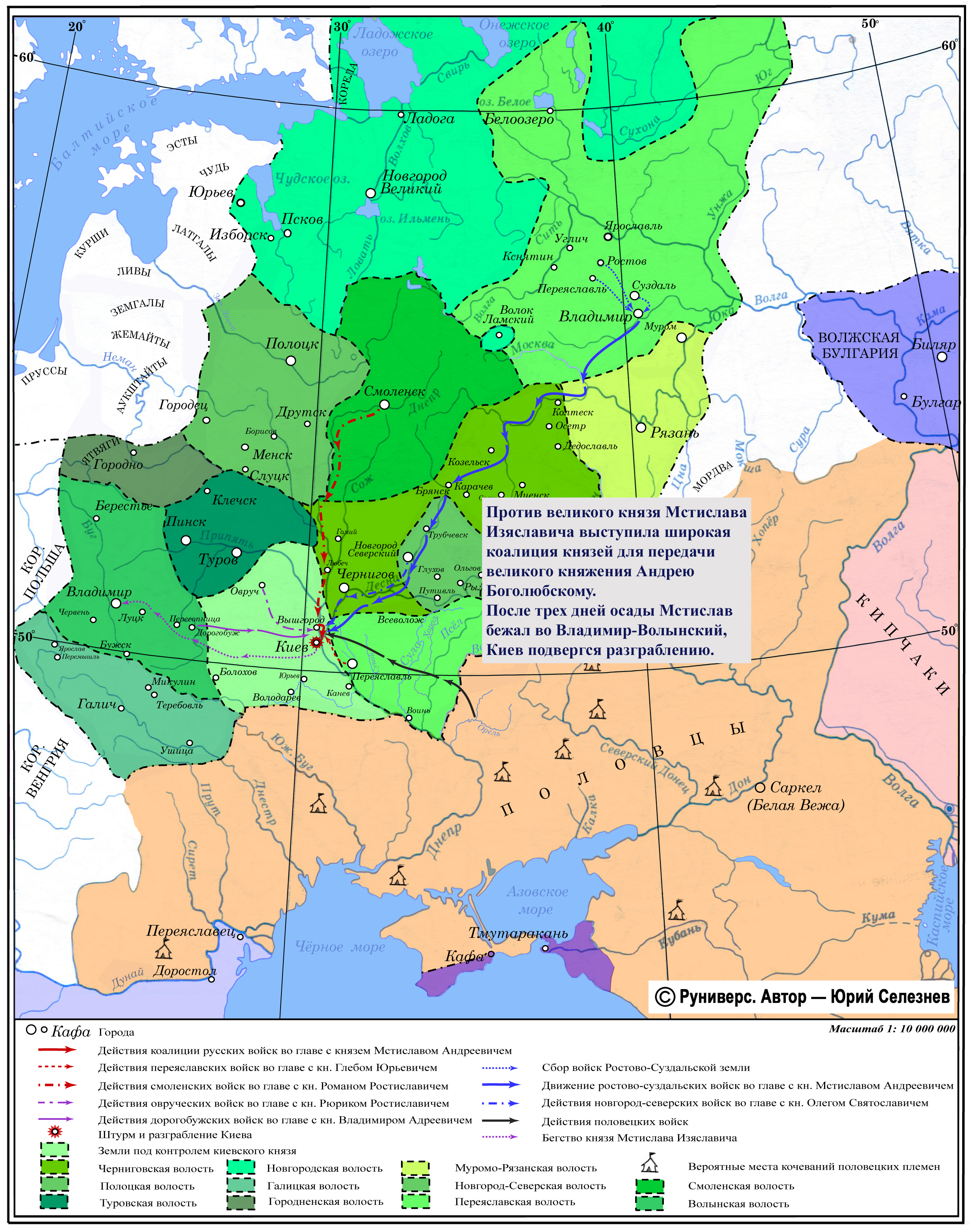 Против великого князя Мстислава Изяславича выступила широкая коалиция князей для передачи великого княжения Андрею Боголюбскому. После трех дней осады Мстислав бежал во Владимир-Волынский, Киев подвергся разграблению.