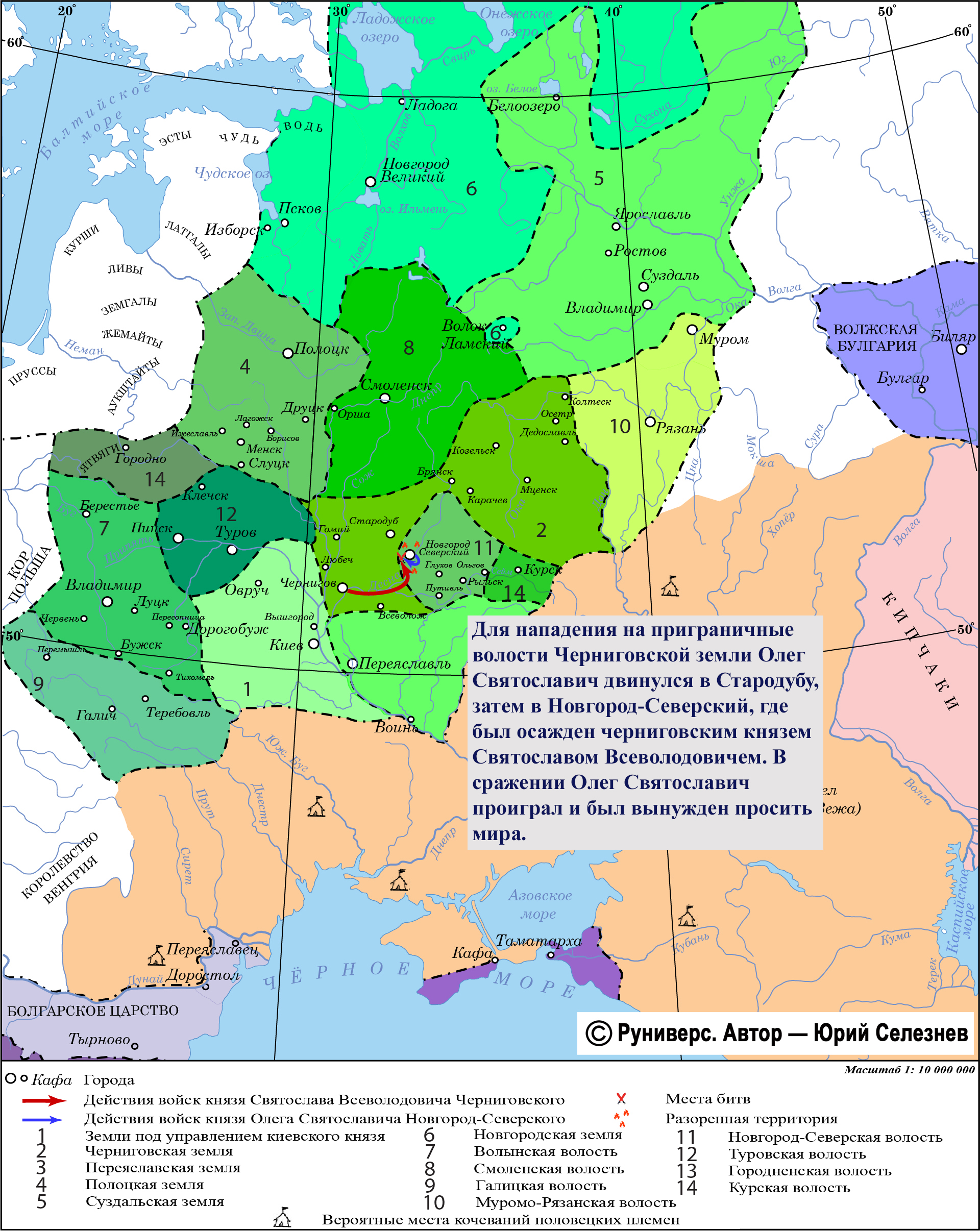 Князь Олег Святославич с дружинами своих братьев двинулся к Стародубу, а оттуда в Новгород-Северский для нападения на приграничные волости. Здесь, в столице своего княжества, он был осажден черниговским князем Святославом Всеволодовичем. Попытавшись победить в полевом сражении, князь Олег Святославич вывел дружины навстречу противнику. Однако его войска дрогнули, и князь вынужден был укрыться за стенами города и выслать послов с просьбой о мире.