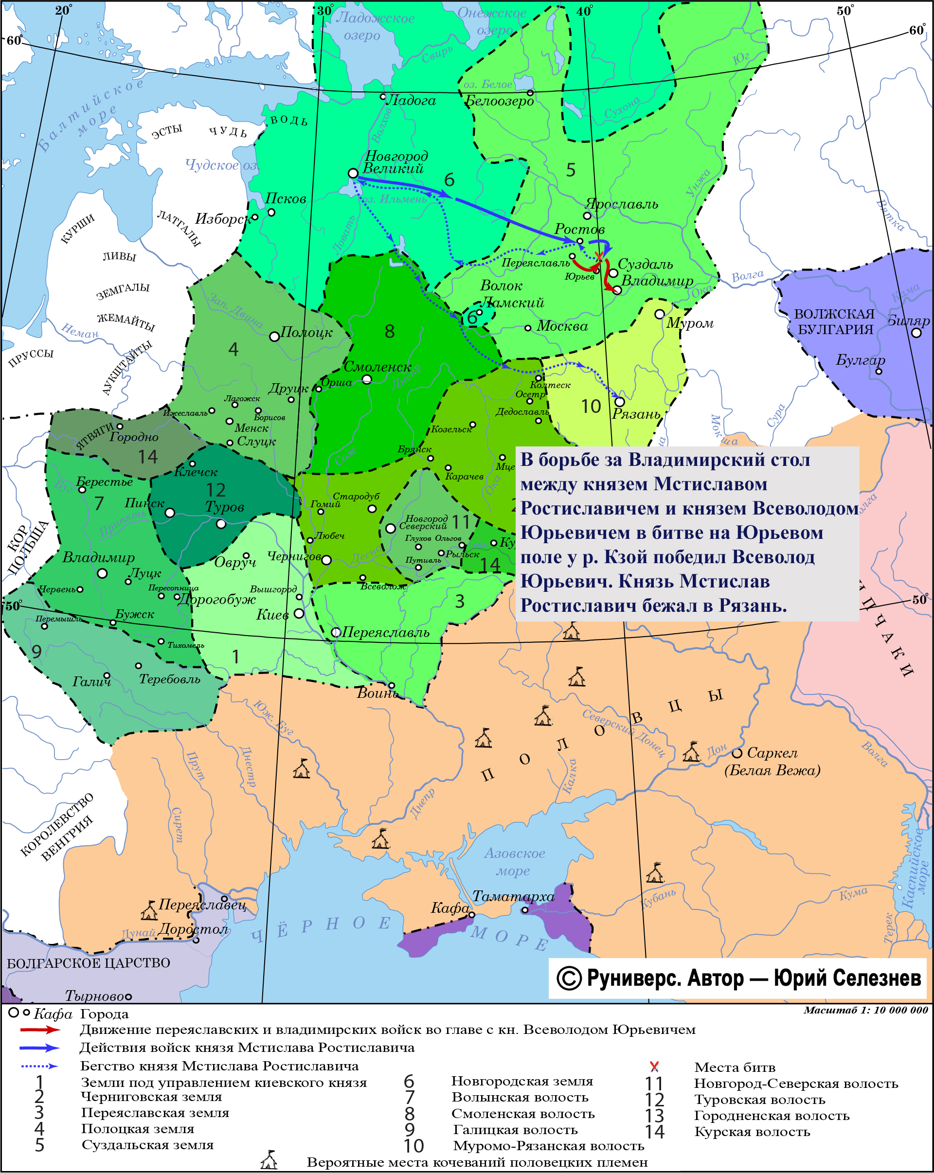 27 июня в битве на Юрьевом поле у р. Кзой сошлись армии двух основных соперников: князя Мстислава Ростиславича и князя Всеволода Юрьевича. Понеся незначительные потери, войска князя Всеволода победили ростовцев, которые лишились в ходе битвы основной части боярства.