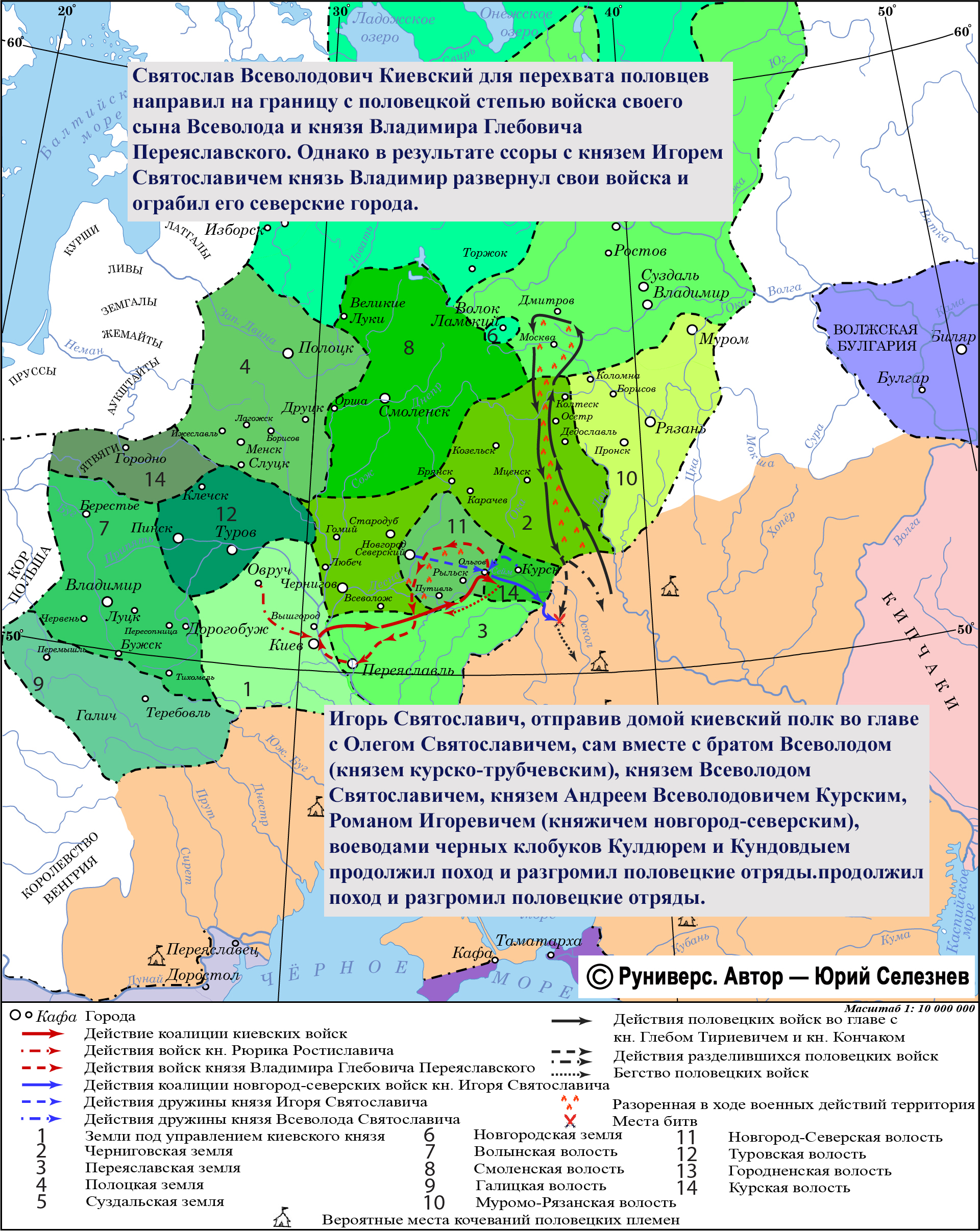 Игорь же, отправив киевский полк домой во главе с Олегом Святославичем, сам вместе с братом Всеволодом (князем курско-трубчевским), князем Всеволодом Святославичем, князем Андреем Всеволодовичем Курским, Романом Игоревичем (княжичем новгород-северским), воеводами черных клобуков Кулдюрем и Кундовдыем продолжил поход, разгромил половецкие отряды, которые не успели до разлива переправиться через реку Хорол.