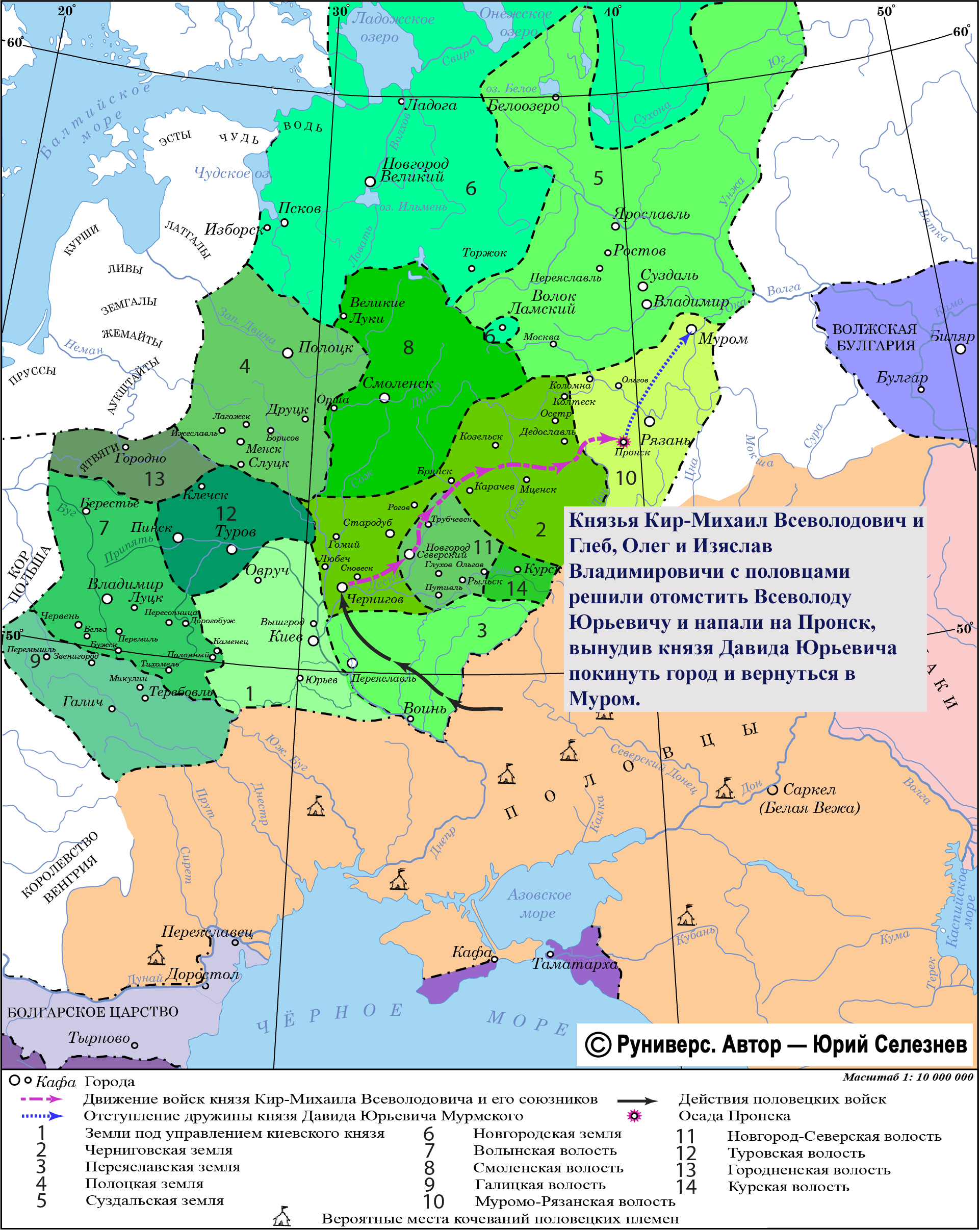 Представители рязанского княжеского дома Кир-Михаил Всеволодович и Глеб, Олег и Изяслав Владимировичи, нашедшие убежище в Черниговской земле после конфликта с Всеволодом Юрьевичем, призвав для усиления своих войск половецкий отряд, блокировали Пронск и вынудили князя Давида Юрьевича, посаженного на престол князем Всеволодом Юрьевичем Суздальским, покинуть город и вернуться в Муром.