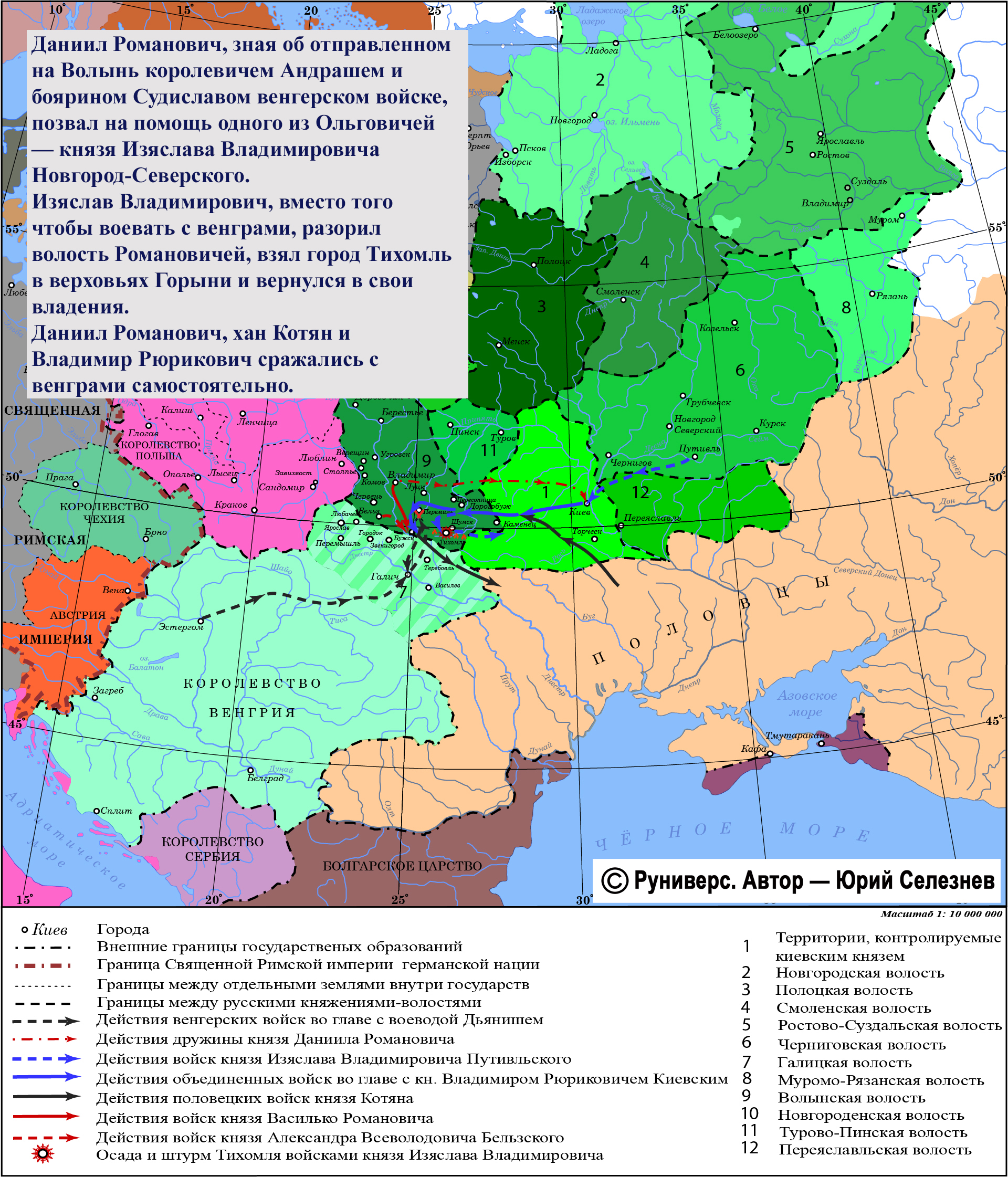 Даниил Романович, зная об отправленном на Волынь королевичем Андрашем и боярином Судиславом венгерском войске, позвал на помощь одного из Ольговичей — князя Изяслава Владимировича Новгород-Северского. Однако последний, вместо того чтобы воевать с венграми, разорил волость Романовичей, взял город Тихомль в верховьях Горыни и вернулся в свои владения, предоставив Даниилу, хану Котяну и Владимиру Рюриковичу бороться с венграми самостоятельно.