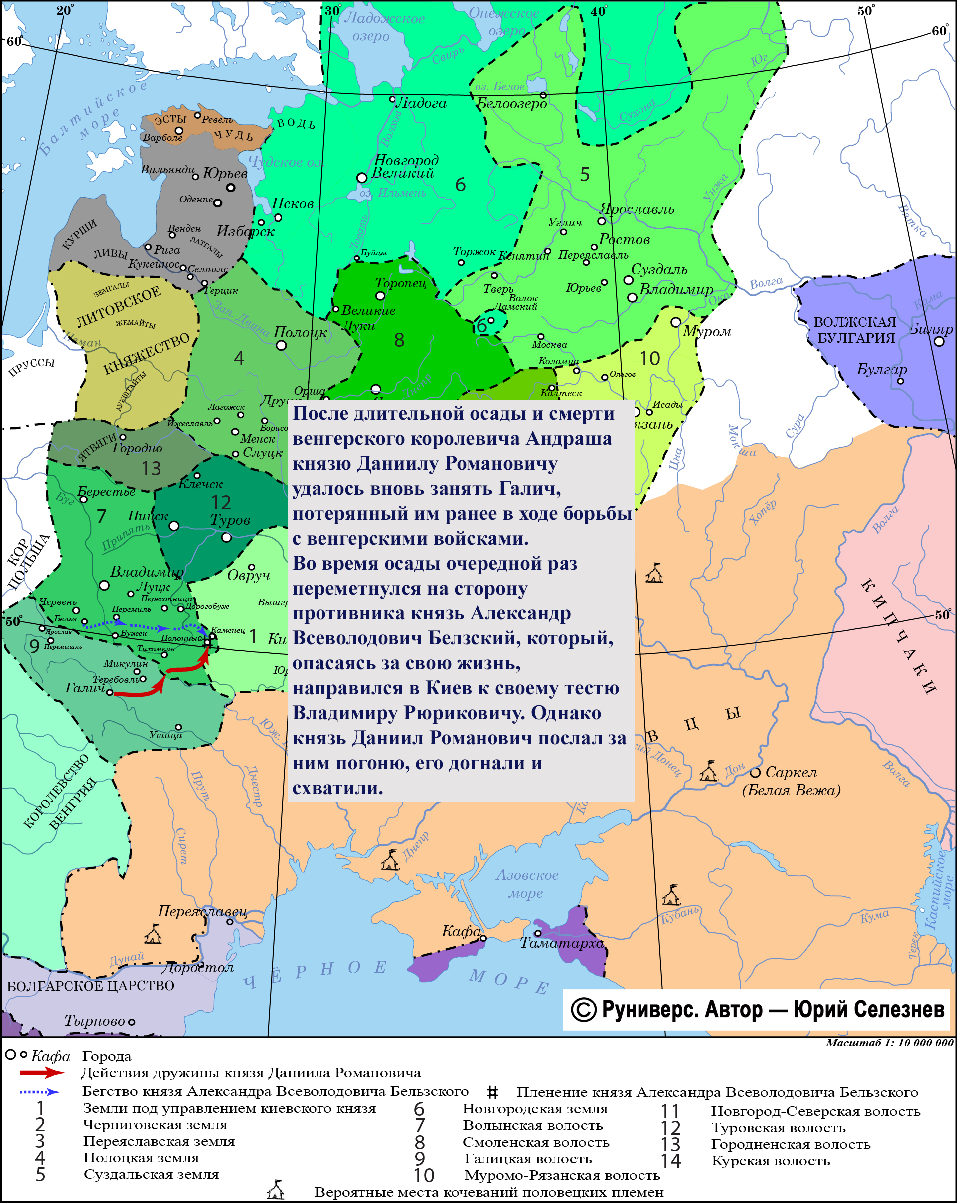 После длительной осады и смерти венгерского королевича Андраша князю Даниилу Романовичу удалось вновь занять Галич, потерянный им ранее в ходе борьбы с венгерскими войсками. Однако во время осады очередной раз переметнулся на сторону противника князь Александр Всеволодович Белзский. После вокняжения князя Даниила Александр Всеволодович, опасаясь за свою жизнь, направился в Киев к своему тестю Владимиру Рюриковичу. Однако князь Даниил Романович послал за ним погоню. Догнали Александра в Полоном и схватили его на луге Хоморском.