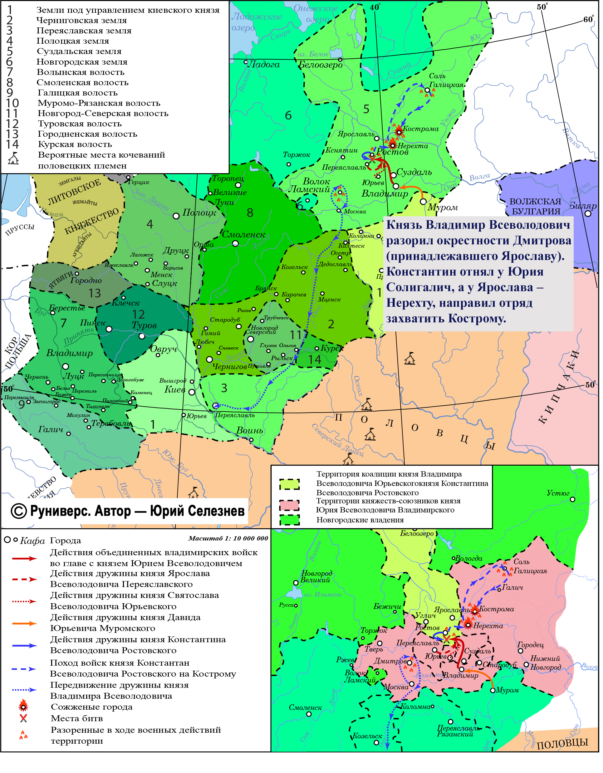 Князь Владимир Всеволодович разорил окрестности Дмитрова (принадлежавшего Ярославу). Константин отнял у Юрия Солигалич, а у Ярослава – Нерехту, направил отряд захватить Кострому. Однако силы Константина оказались ослаблены переходом к Юрию князя Святослава Всеволодовича, который занял Юрьев-Польский.