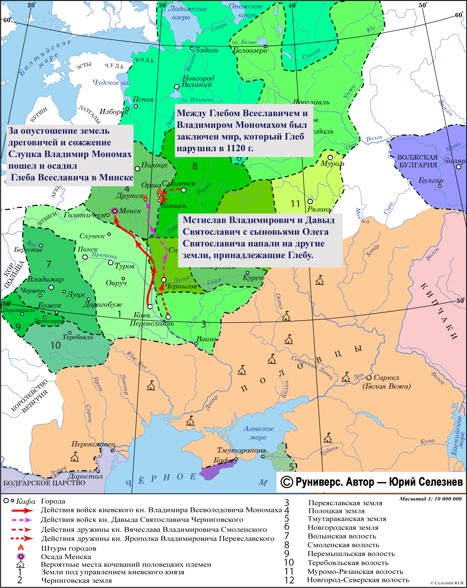 За опустошение земель дреговичей и сожжение Слуцка Владимир Мономах пошел и осадил Глеба Всеславича в Минске Мстислав Владимирович и Давыд Святославич c сыновьями Олега Святославича напали на другие земли, принадлежащие Глебу. Между Глебом Всеславичем и Владимиром Мономахом был заключен мир, который Глеб нарушил в 1120 г.