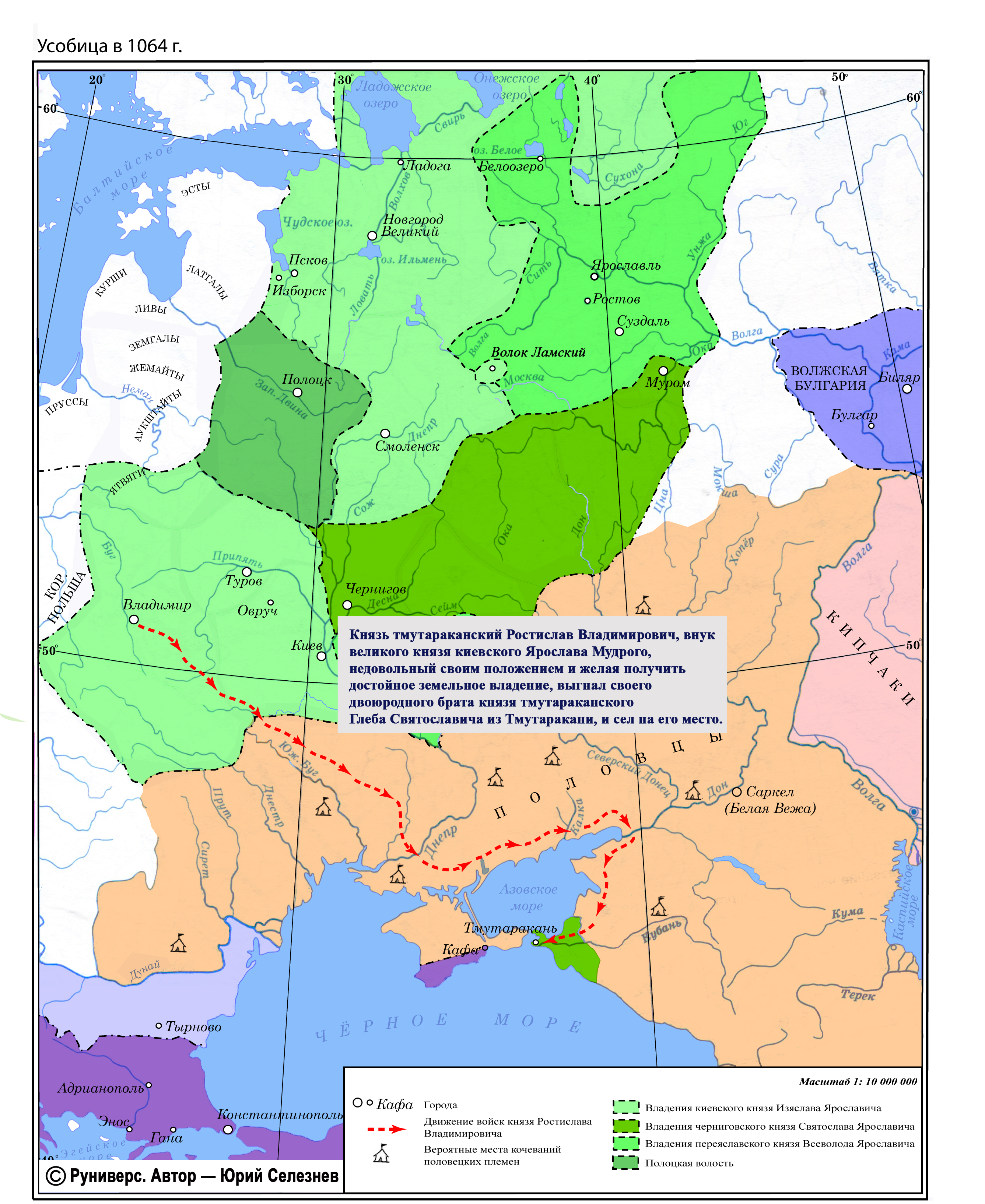 Князь тмутараканский Ростислав Владимирович, внук великого князя киевского Ярослава Мудрого, недовольный своим положением и желая получить достойное земельное владение, выгнал своего двоюродного брата князя тмутараканского Глеба Святославича из Тмутаракани, и сел на его место.