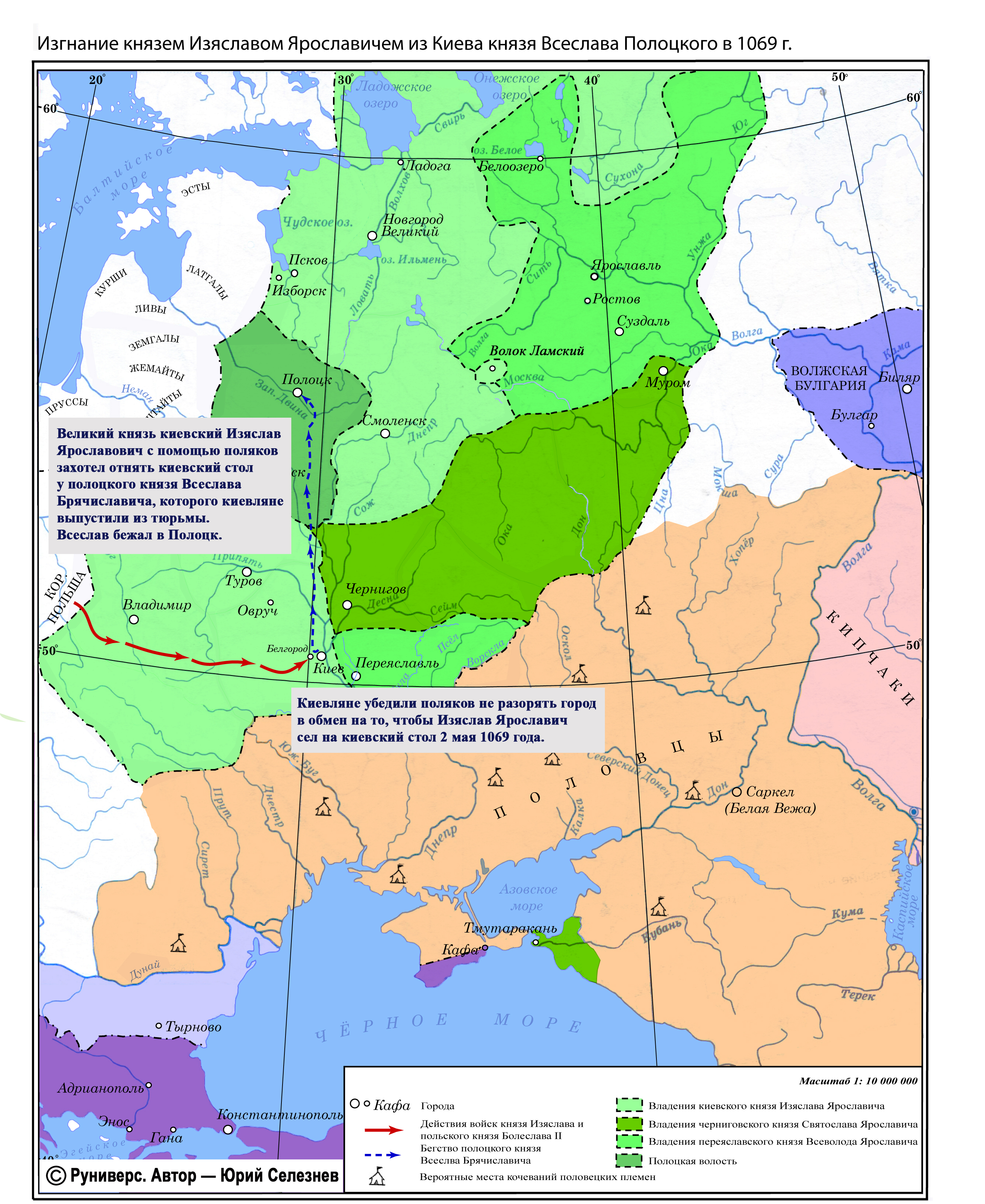 Великий князь киевский Изяслав Ярославович с помощью поляков захотел отнять киевский стол у полоцкого князя Всеслава Брячиславича, которого киевляне выпустили из тюрьмы. Всеслав бежал в Полоцк.Киевляне убедили поляков не разорять город в обмен на то, чтобы Изяслав Ярославич сел на киевский стол 2 мая 1069 года.