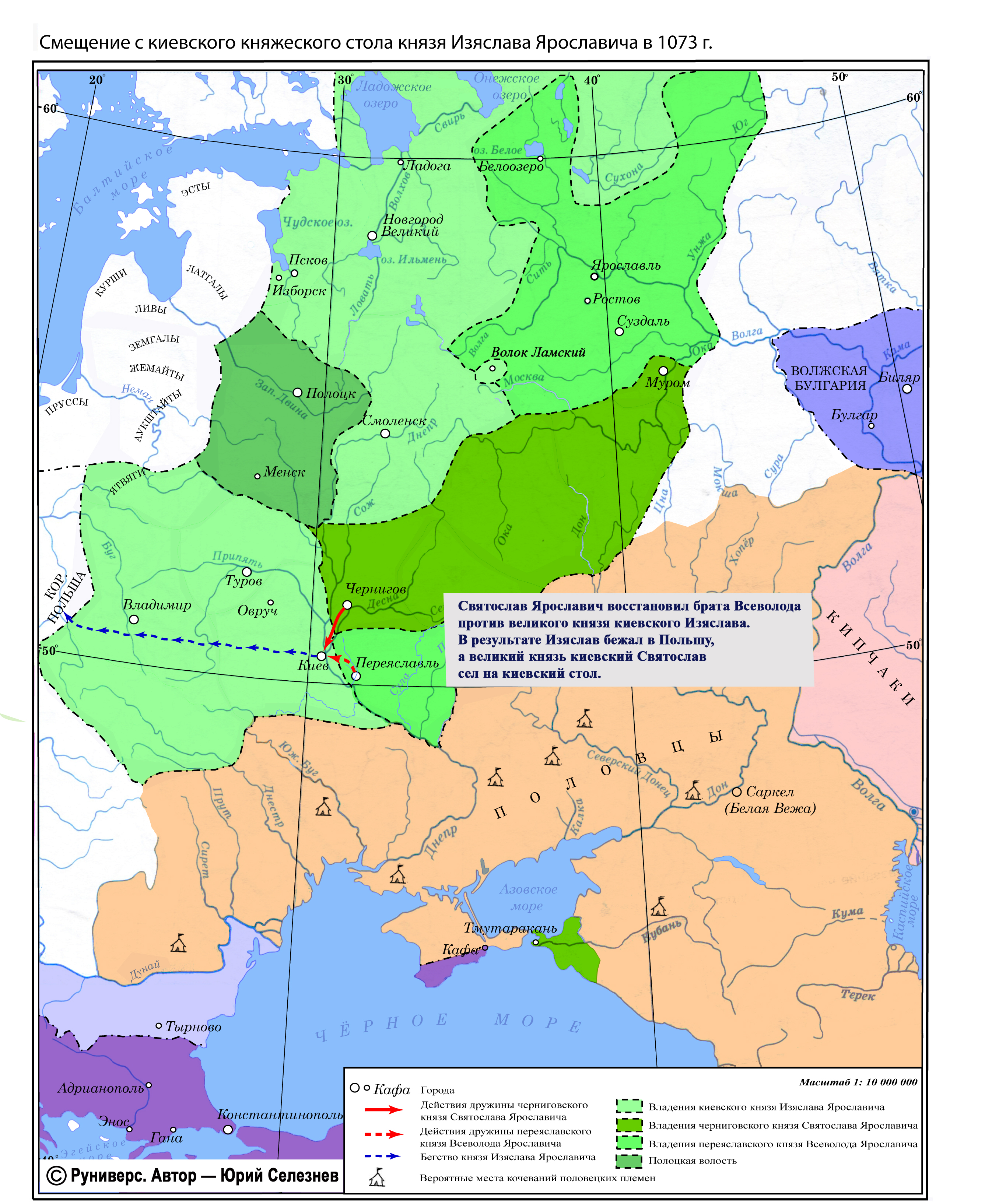Святослав Ярославич восстановил брата Всеволода против великого князя киевского Изяслава, в результате Изяслав бежал в Польшу, а великий князь киевский Святослав сел на киевский стол.