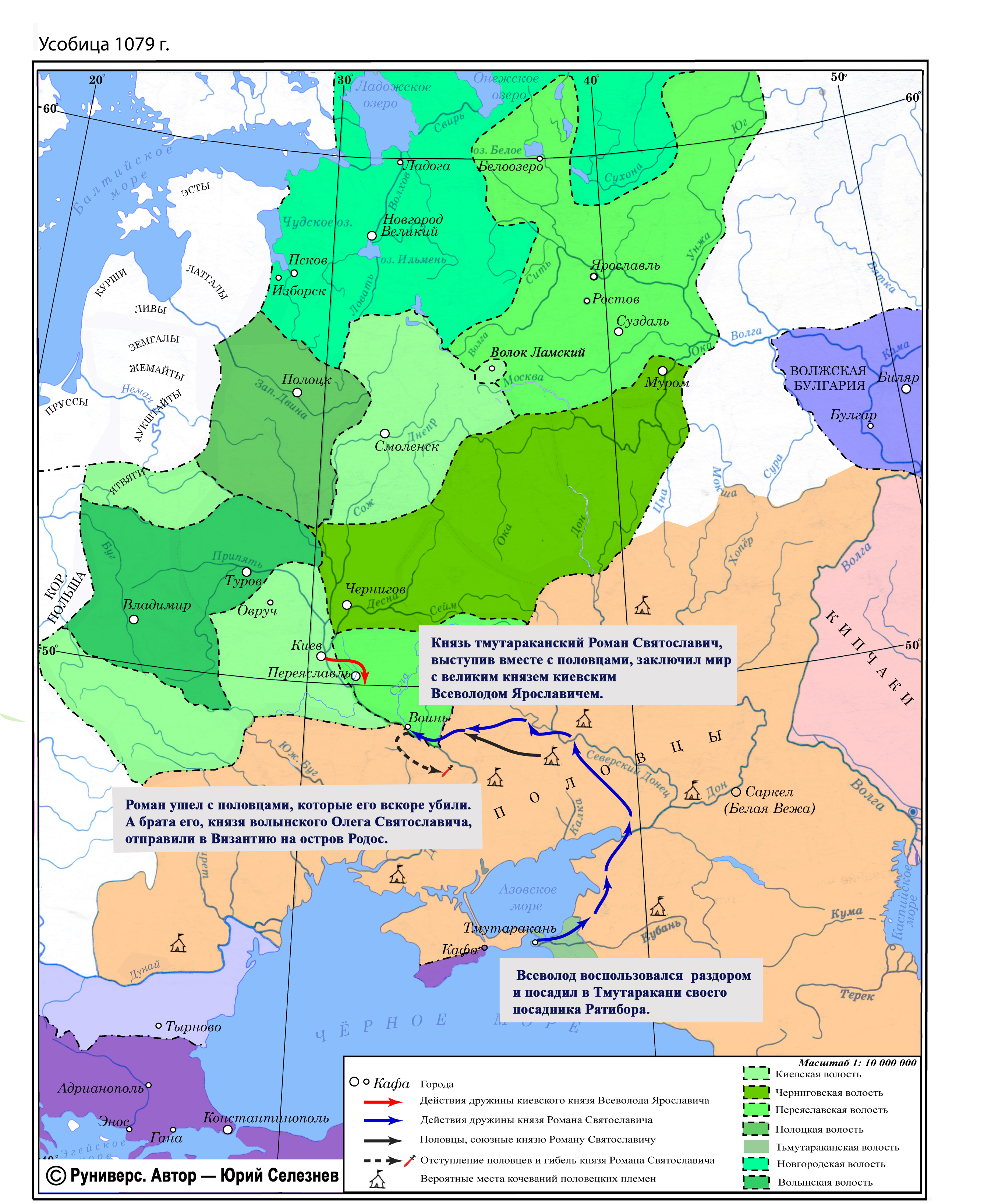Князь тмутараканский Роман Святославич, выступив вместе с половцами, заключил мир с великим князем киевским Всеволодом Ярославичем.Роман ушел с половцами, которые его вскоре убили.А брата его, князя волынского Олега Святославича, отправили в Византию на остров Родос. Всеволод воспользовался раздором и посадил в Тмутаракани своего посадника Ратибора.