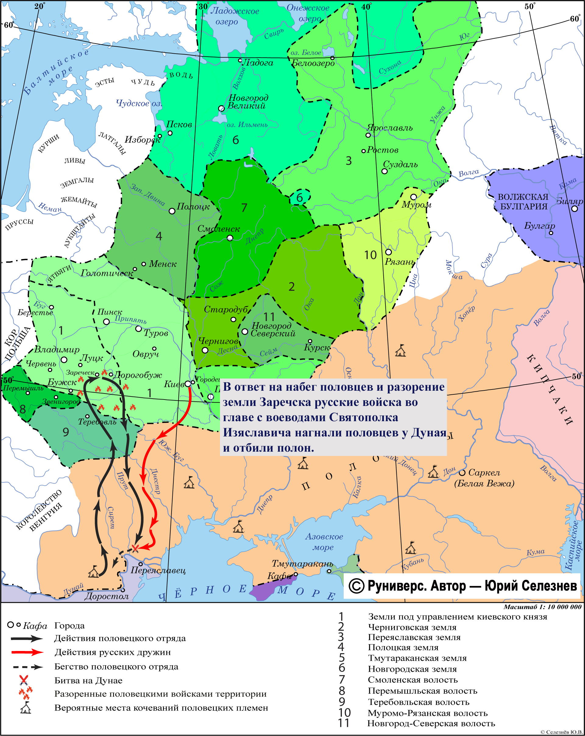 В ответ на набег половцев и разорение земли Заречска русские войска во главе с воеводами Святополка Изяславича нагнали половцев у Дуная и отбили полон.