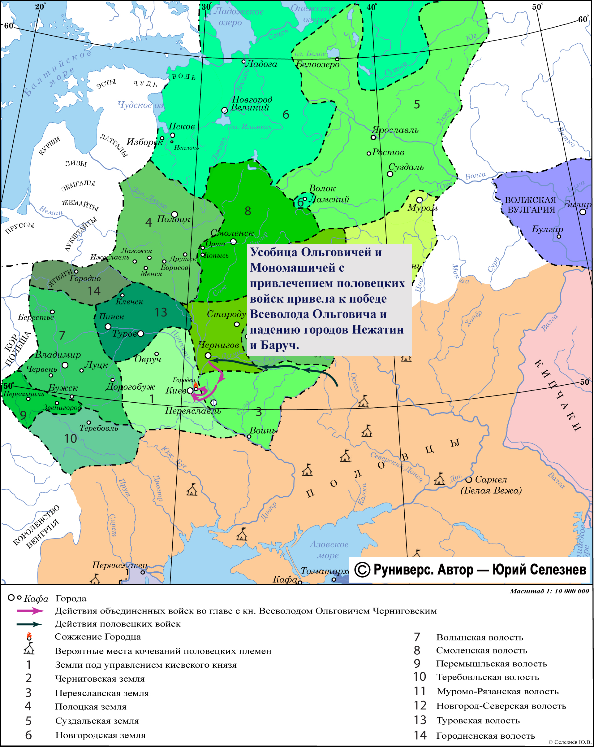 Усобица Ольговичей и Мономашичей с привлечением половецких войск привела к победе Всеволода Ольговича и падению городов Нежатин и Баруч.
