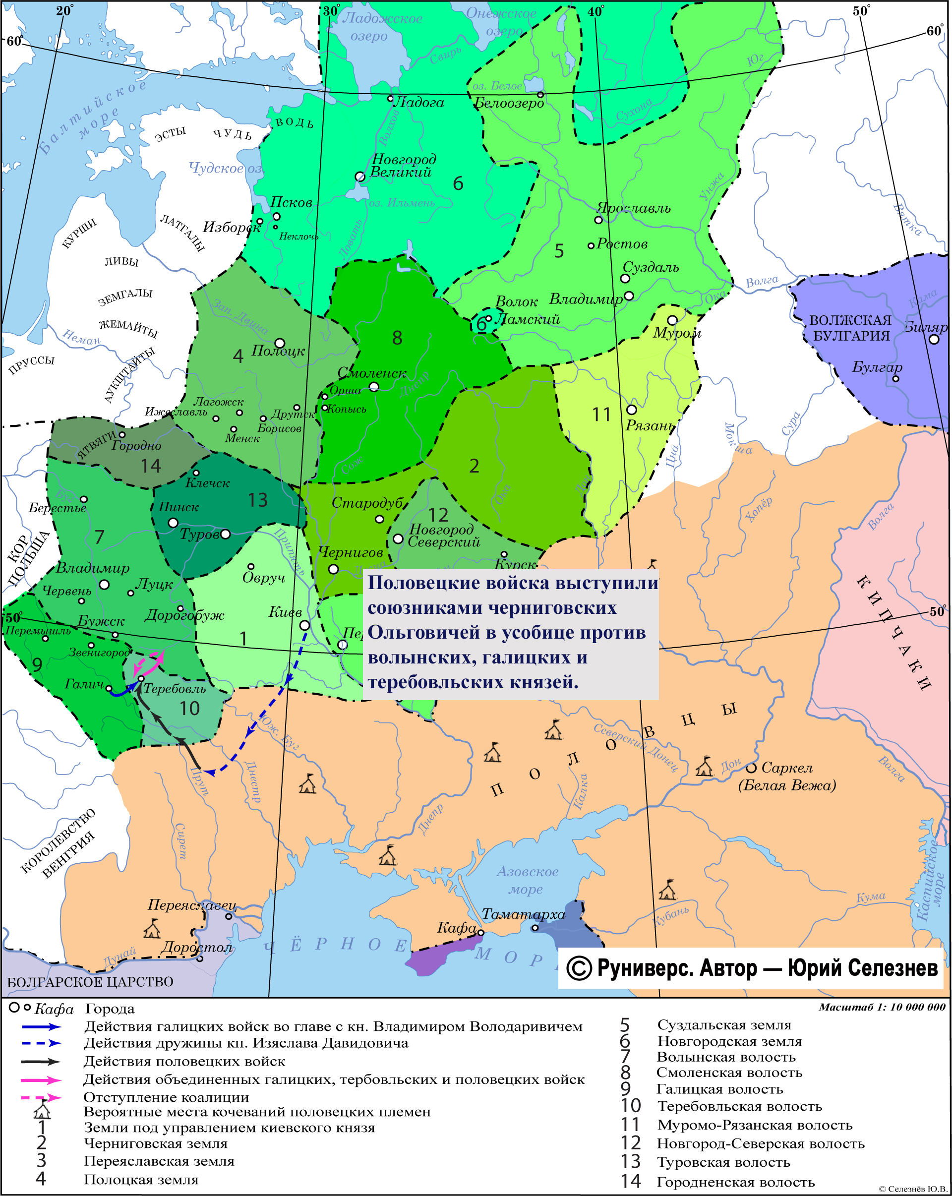 Половецкие войска выступили союзниками черниговских Ольговичей в усобице против волынских, галицких и теребовльских князей.