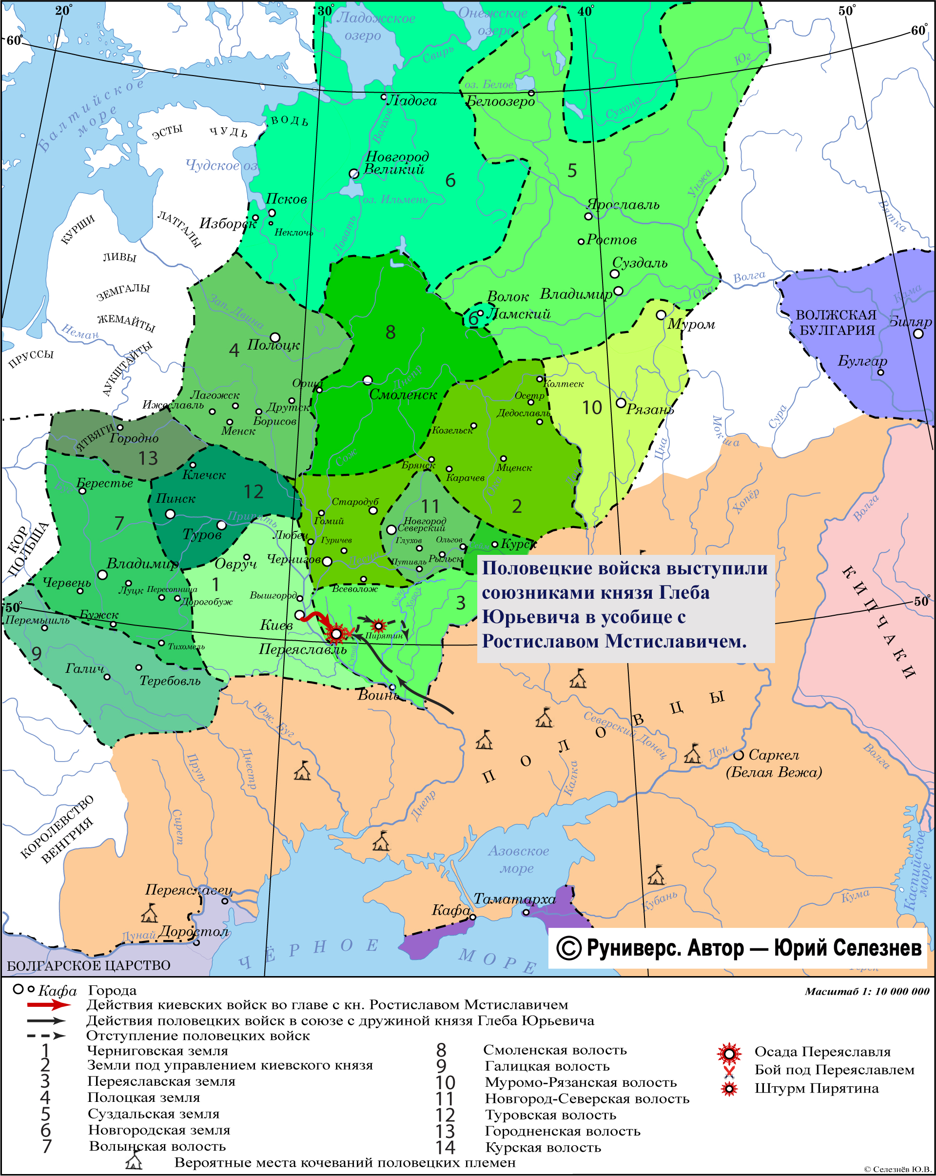 Половецкие войска выступили союзниками князя Глеба Юрьевича в усобице с Ростиславом Мстиславичем.