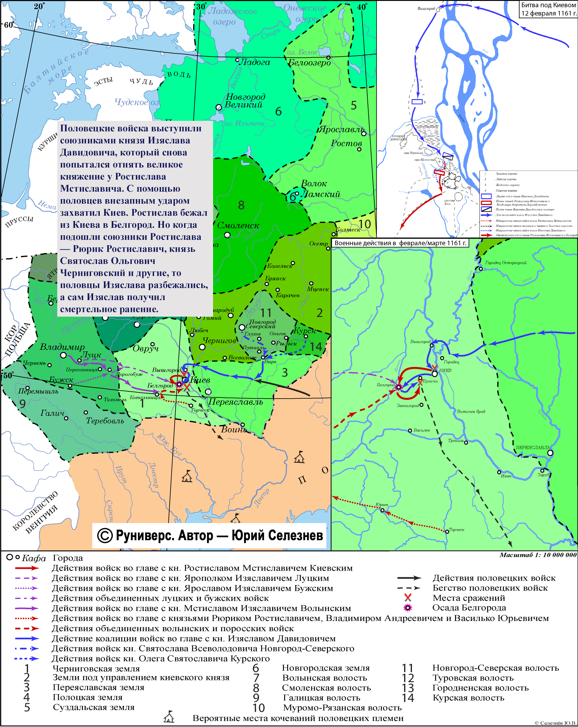 Половецкие войска выступили союзниками князя Изяслава Давидовича, который снова попытался отнять великое княжение у Ростислава Мстиславича. С помощью половцев внезапным ударом захватил Киев. Ростислав бежал из Киева в Белгород. Но когда подошли союзники Ростислава — Рюрик Ростиславич, князь Святослав Ольгович Черниговский и другие, то половцы Изяслава разбежались, а сам Изяслав получил смертельное ранение.