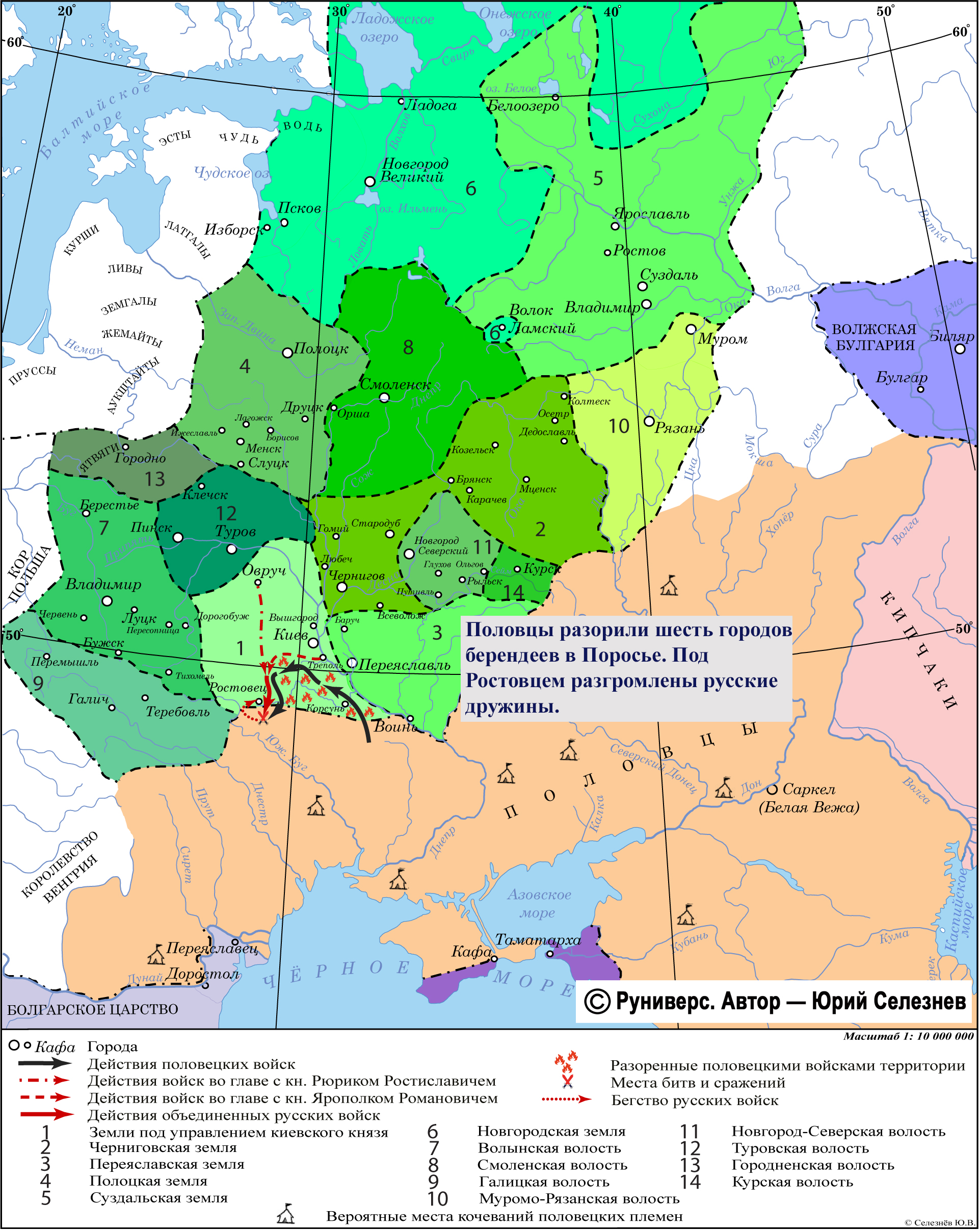 Половцы разорили шесть городов берендеев в Поросье. Под Ростовцем разгромлены русские дружины.