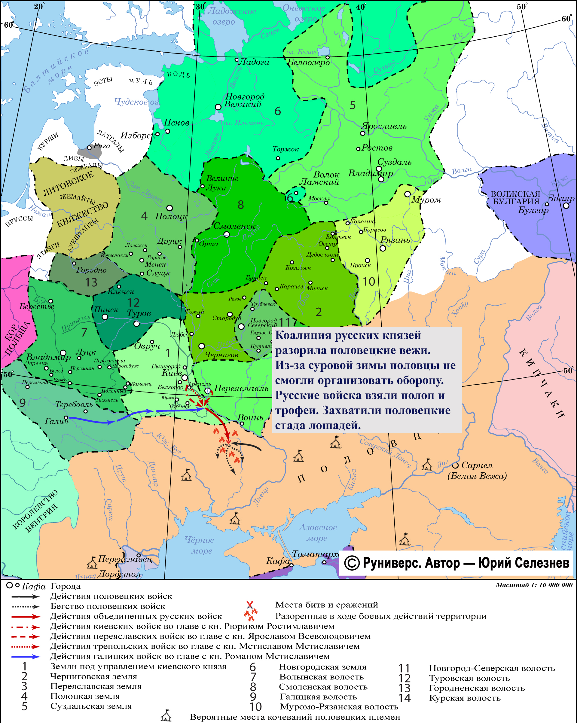 Коалиция русских князей разорила половецкие вежи. Из-за суровой зимы половцы не смогли организовать оборону. Русские войска взяли полон и трофеи. Захватили половецкие стада лошадей.