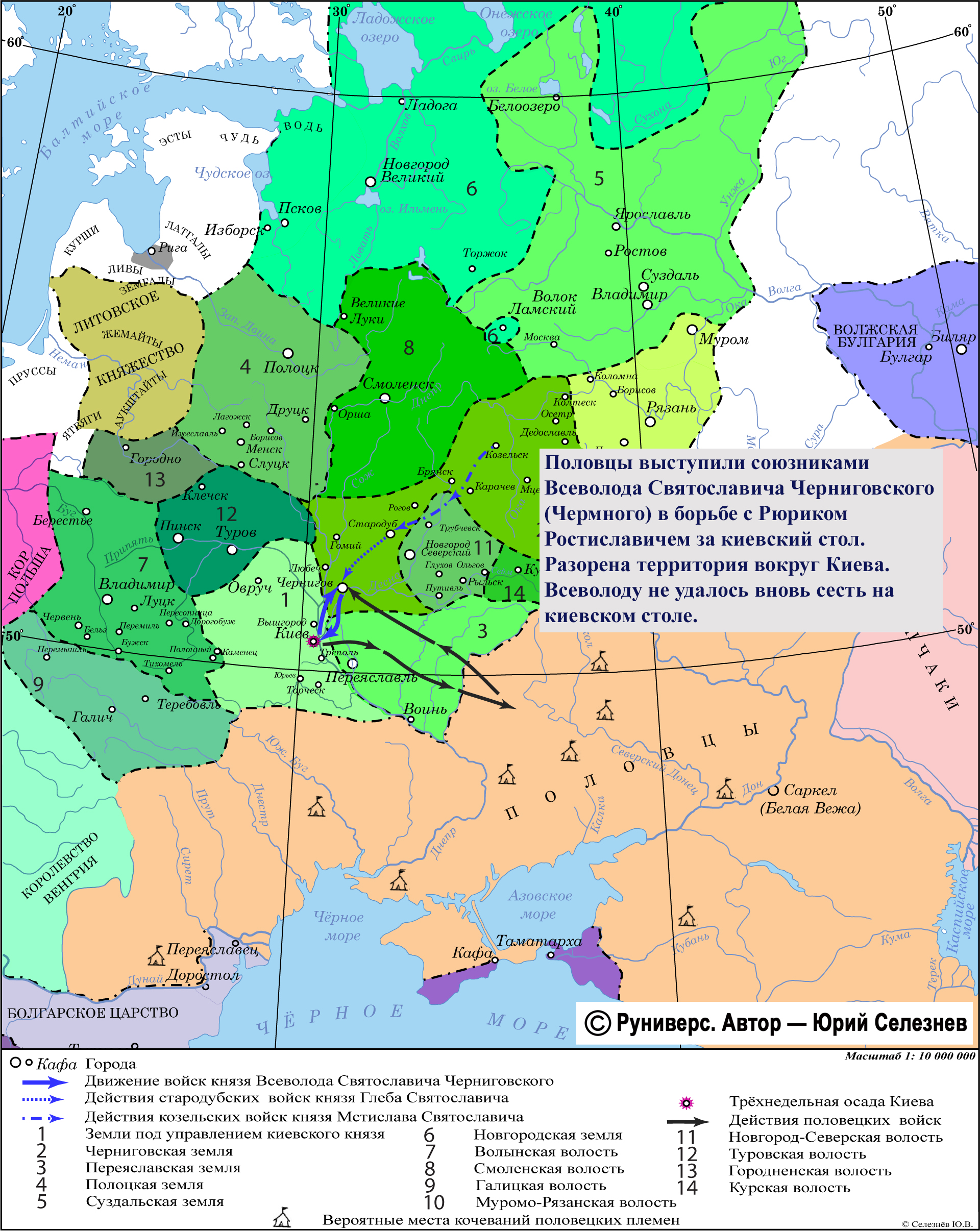 Половцы выступили союзниками Всеволода Святославича Черниговского (Чермного) в борьбе с Рюриком Ростиславичем за киевский стол. Разорена территория вокруг Киева. Всеволоду не удалось вновь сесть на киевском столе.