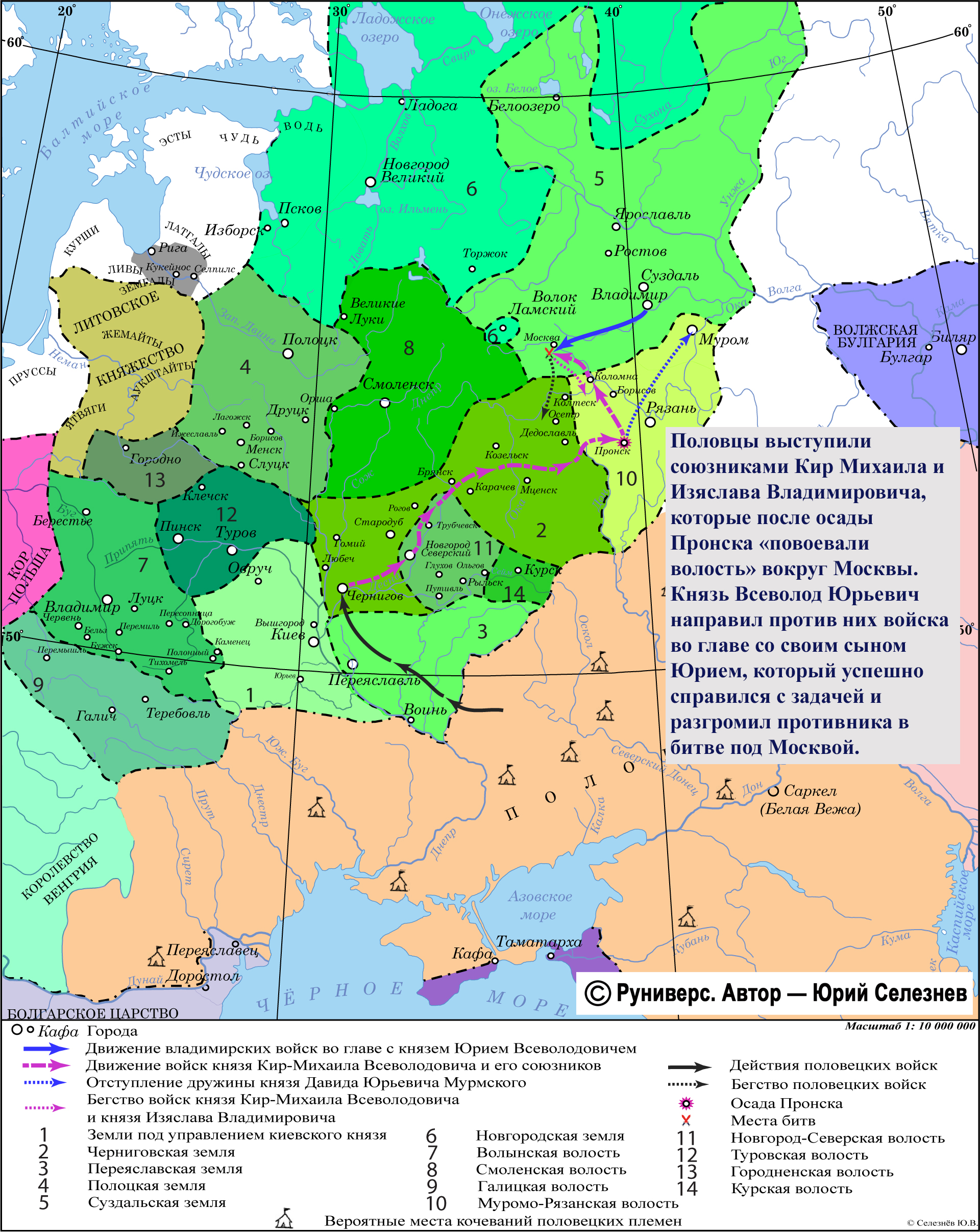 Половцы выступили союзниками Кир Михаила и Изяслава Владимировича, которые после осады Пронска «повоевали волость» вокруг Москвы. Князь Всеволод Юрьевич направил против них войска во главе со своим сыном Юрием, который успешно справился с задачей и разгромил противника в битве под Москвой.