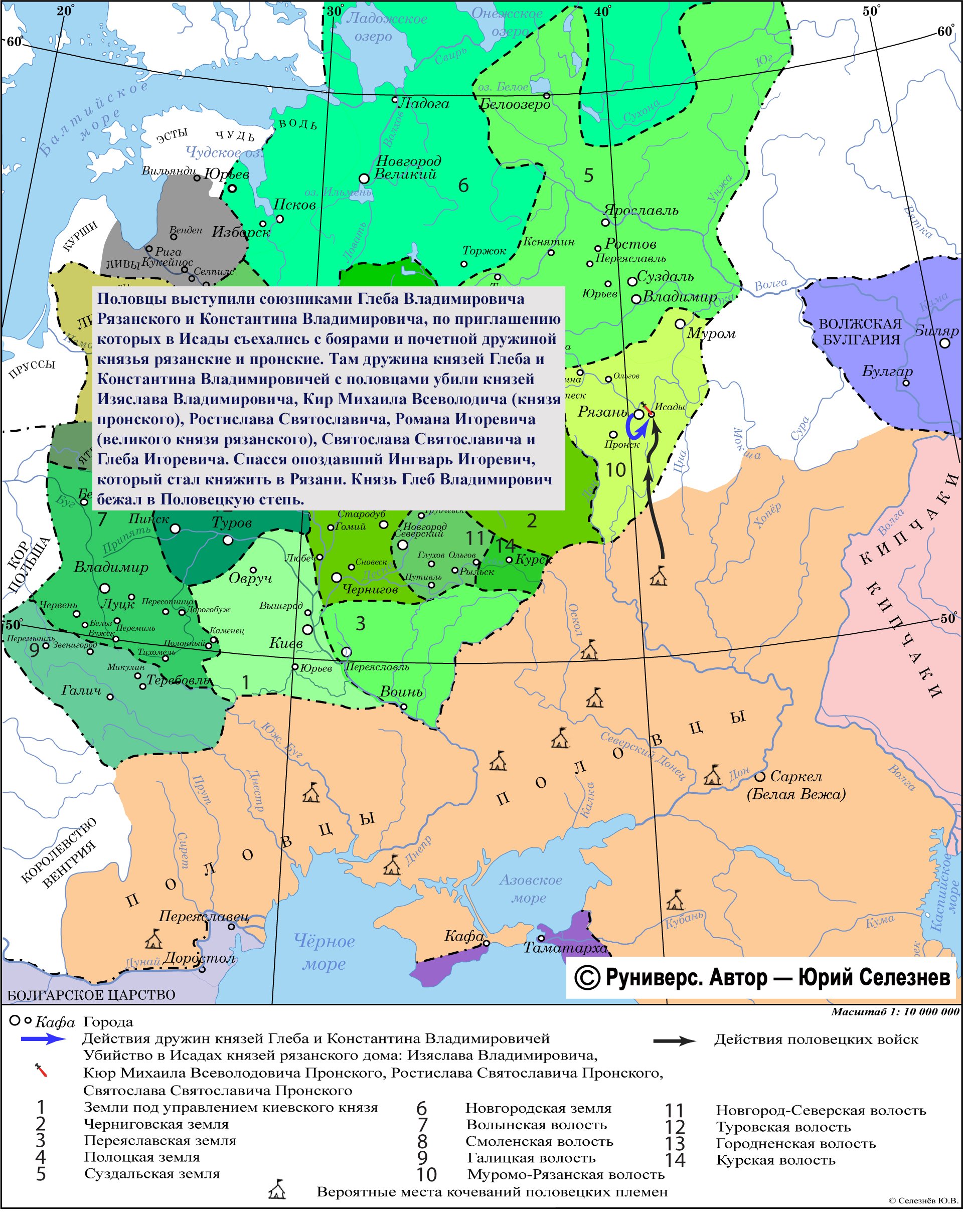 Половцы выступили союзниками Глеба Владимировича Рязанского и Константина Владимировича, по приглашению которых в Исады съехались с боярами и почетной дружиной князья рязанские и пронские. Там дружина князей Глеба и Константина Владимировичей с половцами убили князей Изяслава Владимировича, Кир Михаила Всеволодича (князя пронского), Ростислава Святославича, Романа Игоревича (великого князя рязанского), Святослава Святославича и Глеба Игоревича. Спасся опоздавший Ингварь Игоревич, который стал княжить в Рязани. Князь Глеб Владимирович бежал в Половецкую степь.