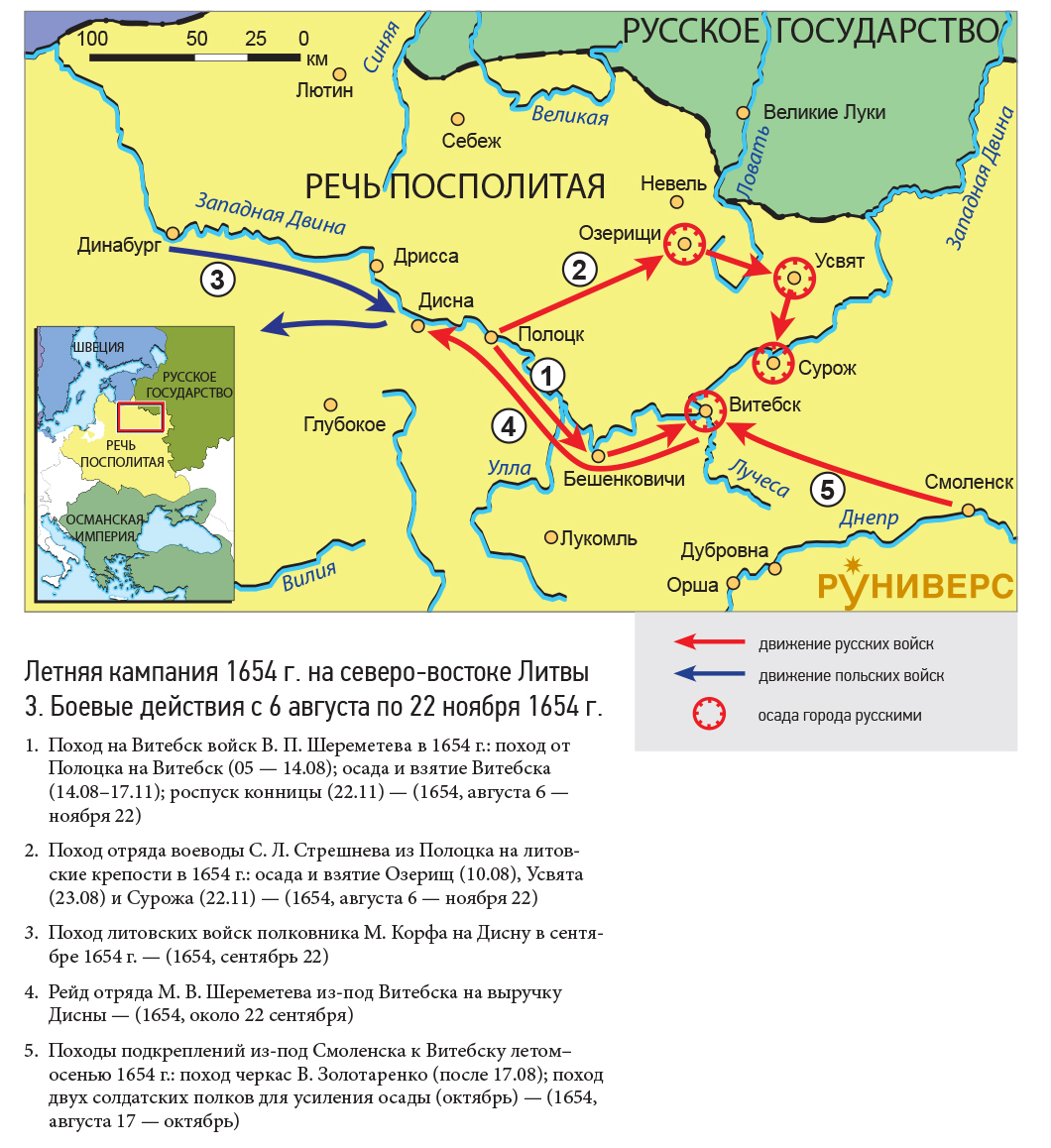 1. Поход на Витебск войск В. П. Шереметева в 1654 г.: поход от Полоцка на Витебск (05 — 14.08); осада и взятие Витебска