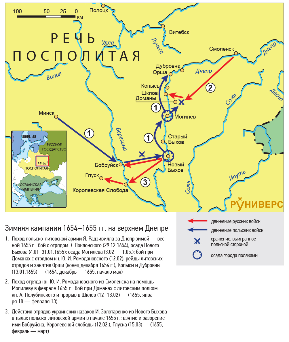 1. Поход польско-литовской армии Я. Радзивилла за Днепр зимой — весной 1655 г.: бой с отрядом К. Поклонского (29.12.1654), осада Нового Быхова (4.01–31.01.1655); осада Могилева (3.02 — 1.05.); бой при Доманах с отрядом кн. Ю. И. Ромодановского (12.02); рейды литовских отрядов и занятие Орши (конец декабря 1654 г.), Копыси и Дубровны (13.01.1655) — (1654, декабрь — 1655, начало мая)