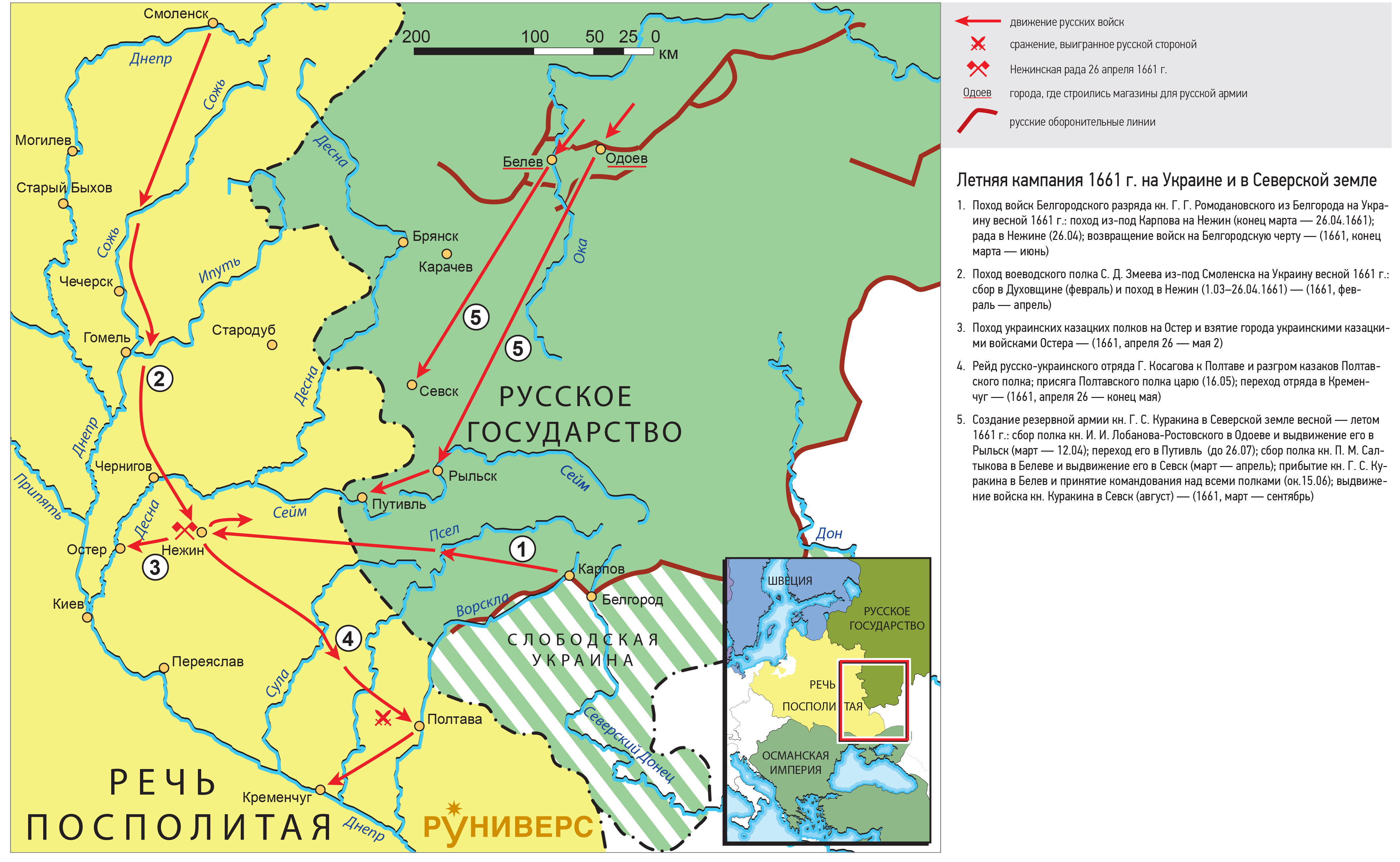 1. Поход войск Белгородского разряда кн. Г. Г. Ромодановского из Белгорода на Украину весной 1661 г.: поход из-под Карпова на Нежин (конец марта — 26.04.1661); рада в Нежине (26.04); возвращение войск на Белгородскую черту — (1661, конец