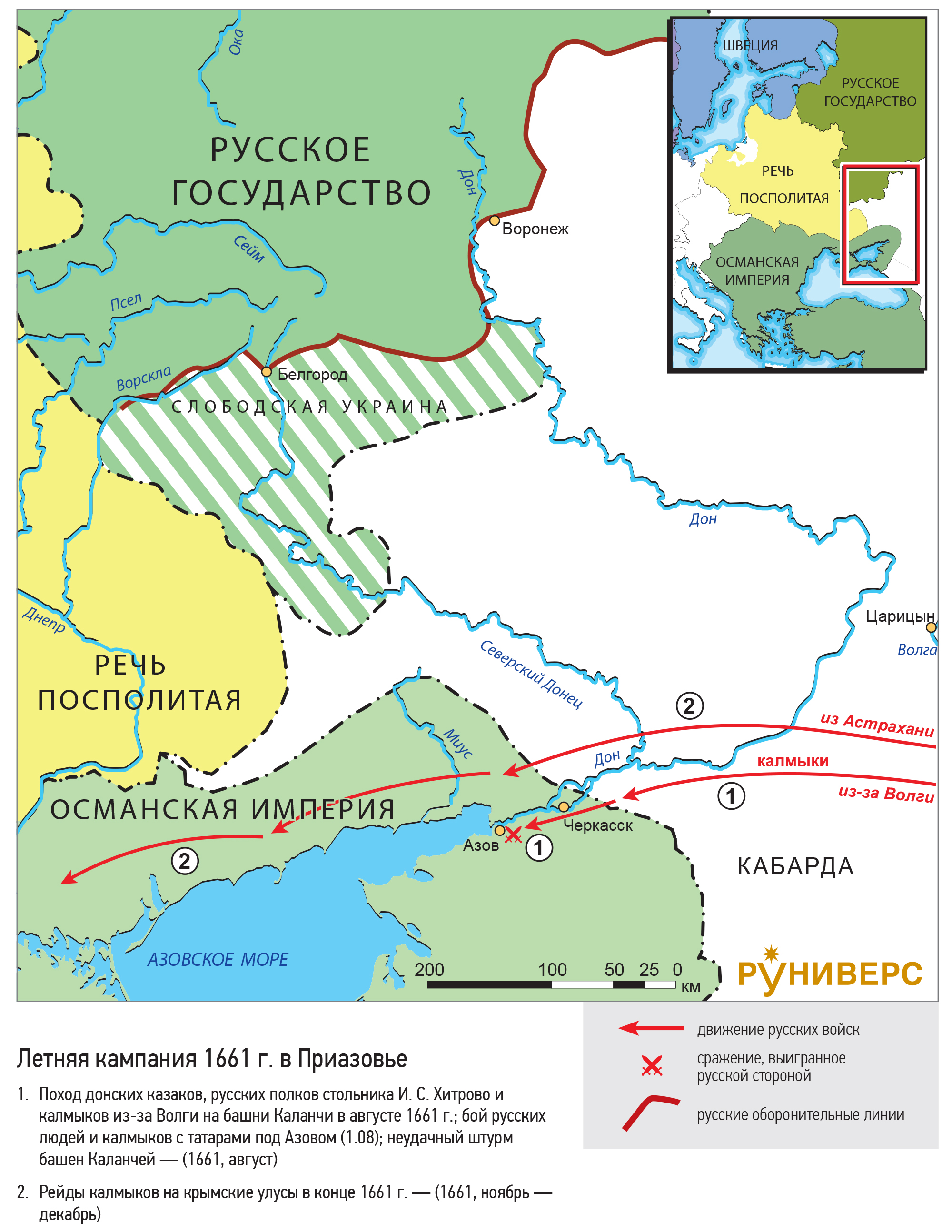 1. Поход донских казаков, русских полков стольника И. С. Хитрово и калмыков из-за Волги на башни Каланчи в августе 1661 г.; бой русских людей и калмыков с татарами под Азовом (1.08); неудачный штурм башен Каланчей — (1661, август)