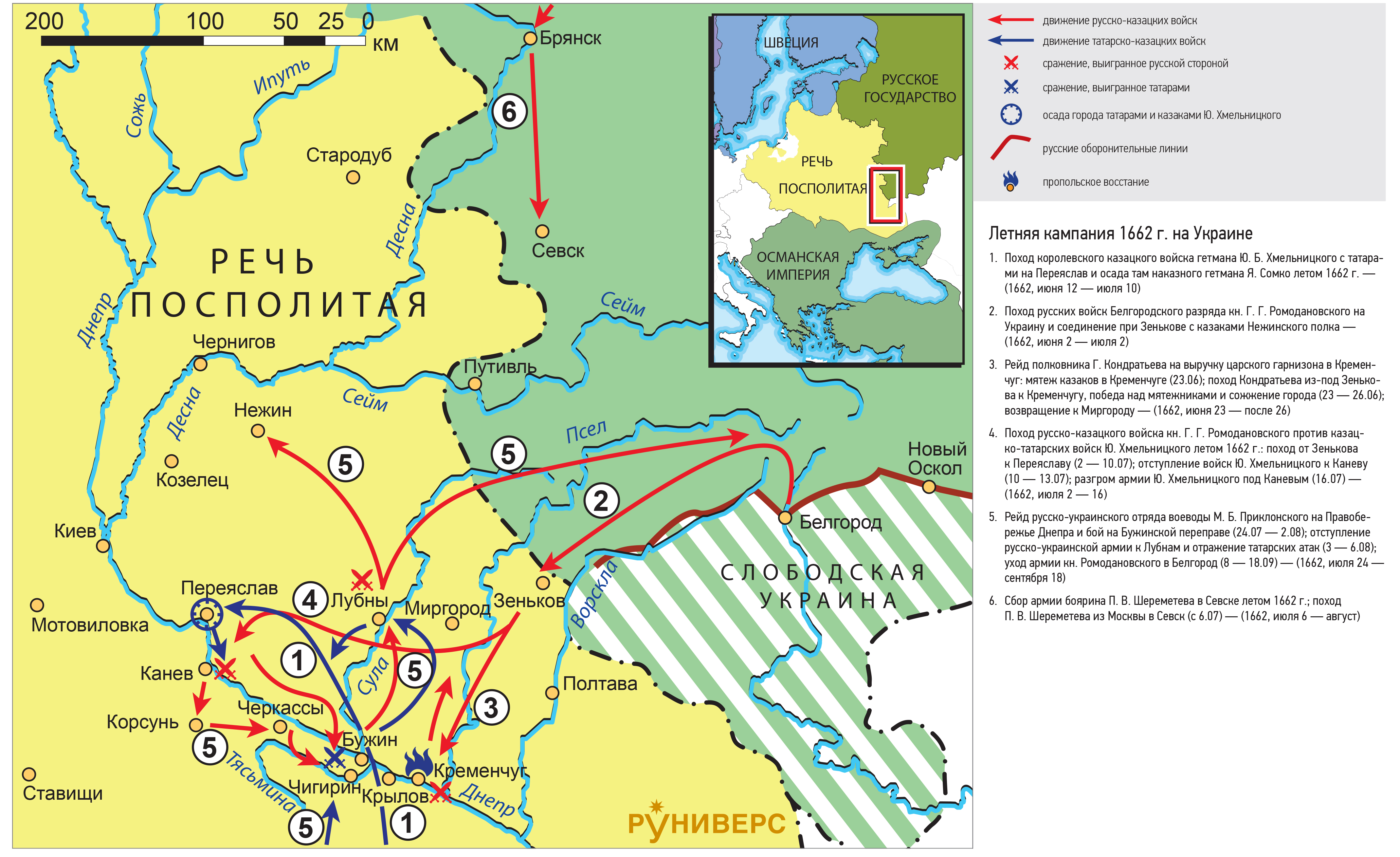 4. Поход русско-казацкого войска кн. Г. Г. Ромодановского против казацко-татарских войск Ю. Хмельницкого летом 1662 г.: поход от Зенькова к Переяславу (2 — 10.07); отступление войск Ю. Хмельницкого к Каневу (10 — 13.07); разгром армии Ю. Хмельницкого под Каневым (16.07) — (1662, июля 2 — 16)