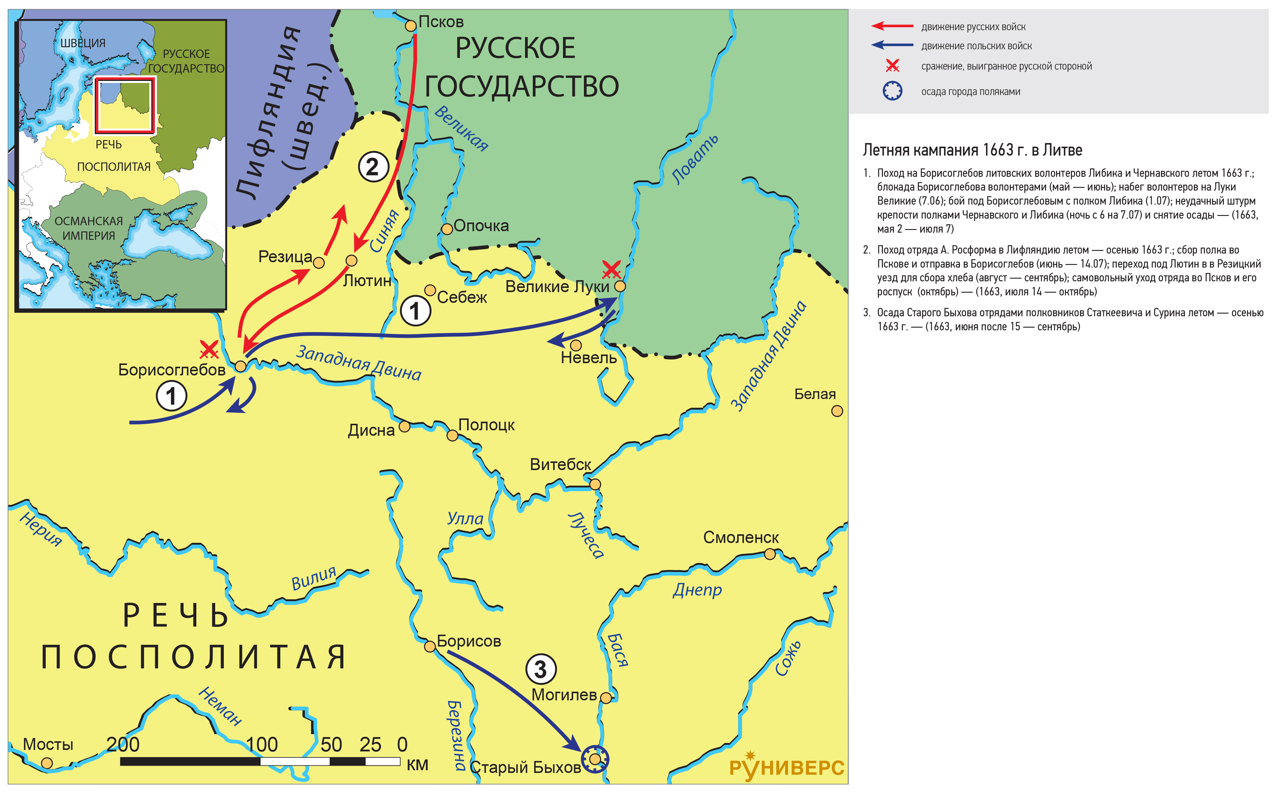 1. Поход на Борисоглебов литовских волонтеров Либика и Чернавского летом 1663 г.; блокада Борисоглебова волонтерами (май — июнь); набег волонтеров на Луки Великие (7.06); бой под Борисоглебовым с полком Либика (1.07); неудачный штурм крепости полками Чернавского и Либика (ночь с 6 на 7.07) и снятие осады — (1663, мая 2 — июля 7)
