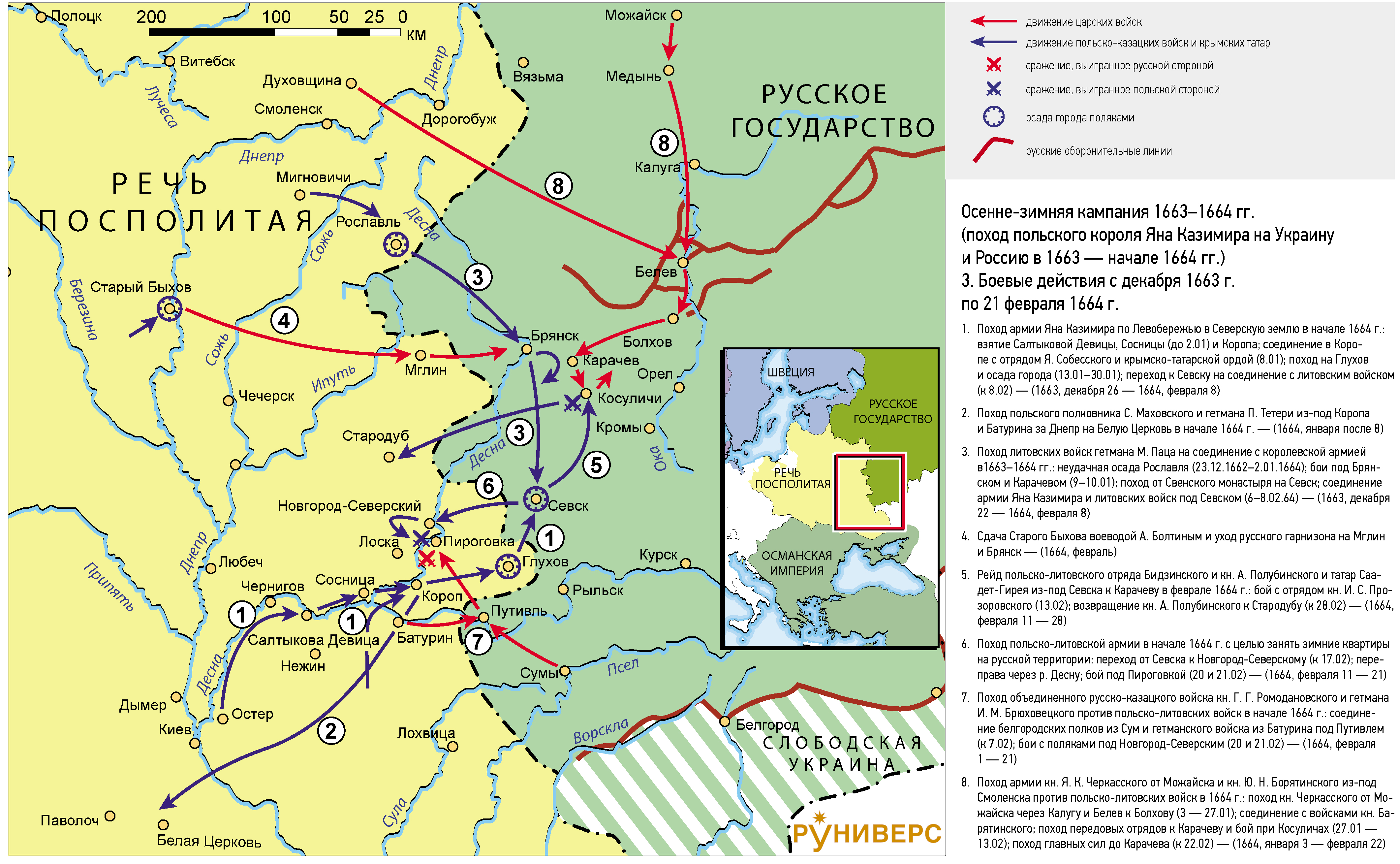 6. Поход польско-литовской армии в начале 1664 г. с целью занять зимние квартиры на русской территории: переход от Севска к Новгород-Северскому (к 17.02); переправа через р. Десну; бой под Пироговкой (20 и 21.02) — (1664, февраля 11 — 21)
