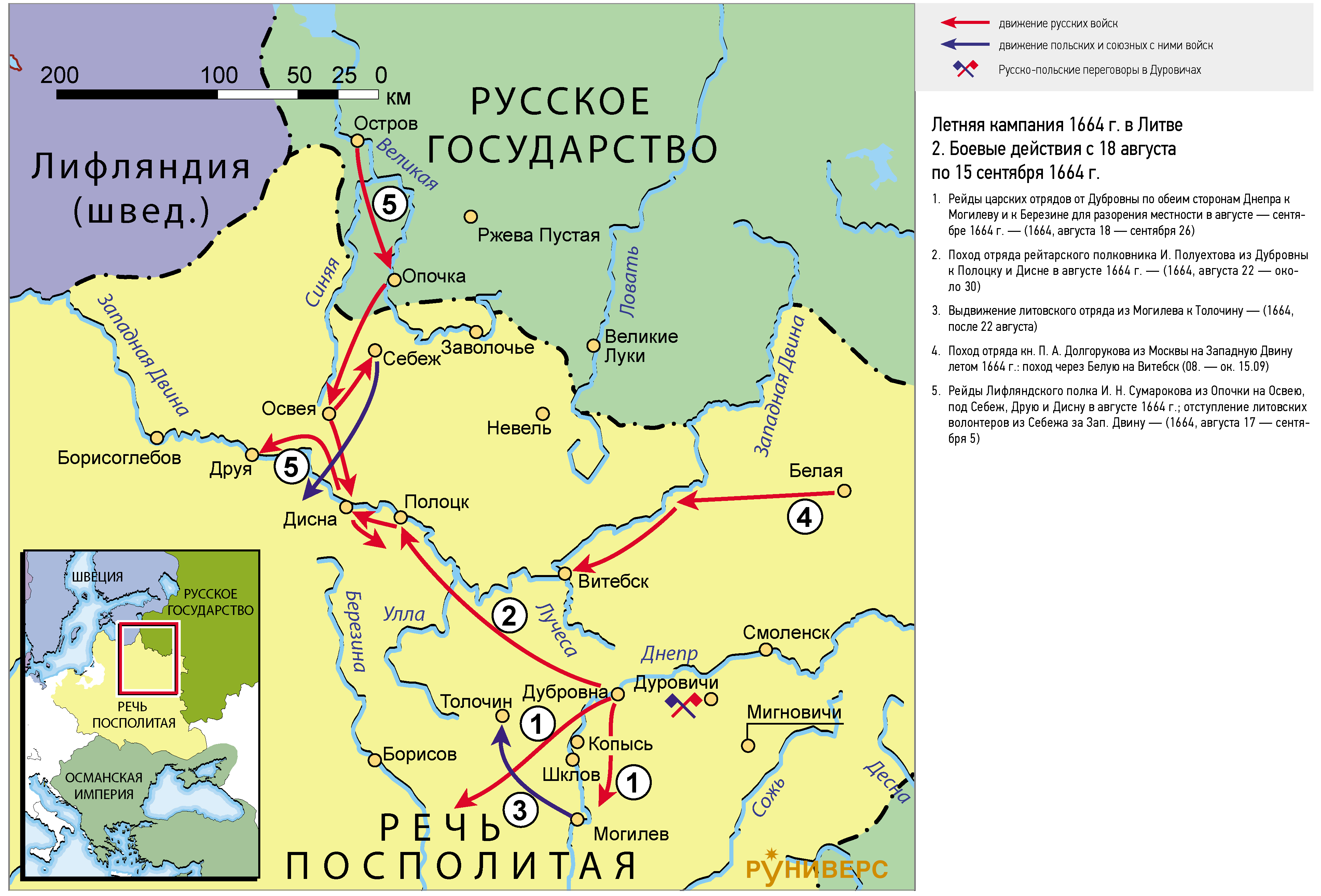 1. Рейды царских отрядов от Дубровны по обеим сторонам Днепра к Могилеву и к Березине для разорения местности в августе — сентябре 1664 г. — (1664, августа 18 — сентября 26)