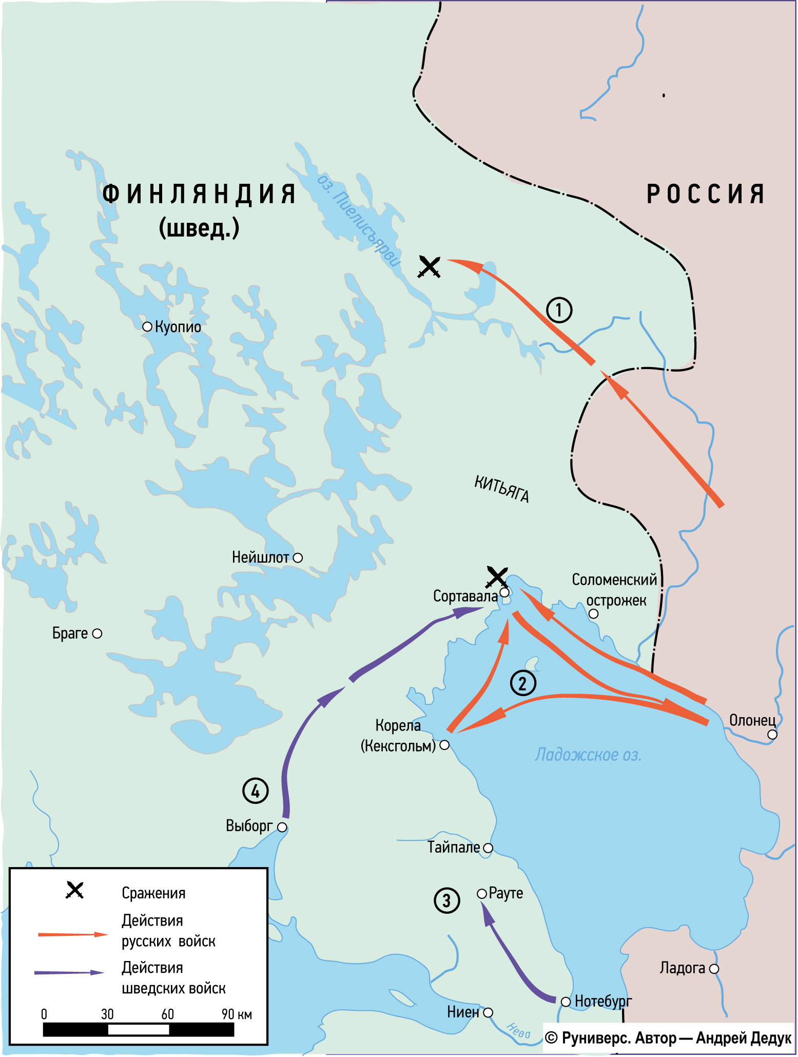 4. Поход шведского отряда Э. Крузе из Або и Выборга в Кирьянский погост (Куркийоки) под началом Э. Крузе и устройство острожка в Сортавале; бой под Сортавалой с русским отрядом кн. А. Вяземского из Олонца (начало октября) — (1657, сентябрь — октябрь).