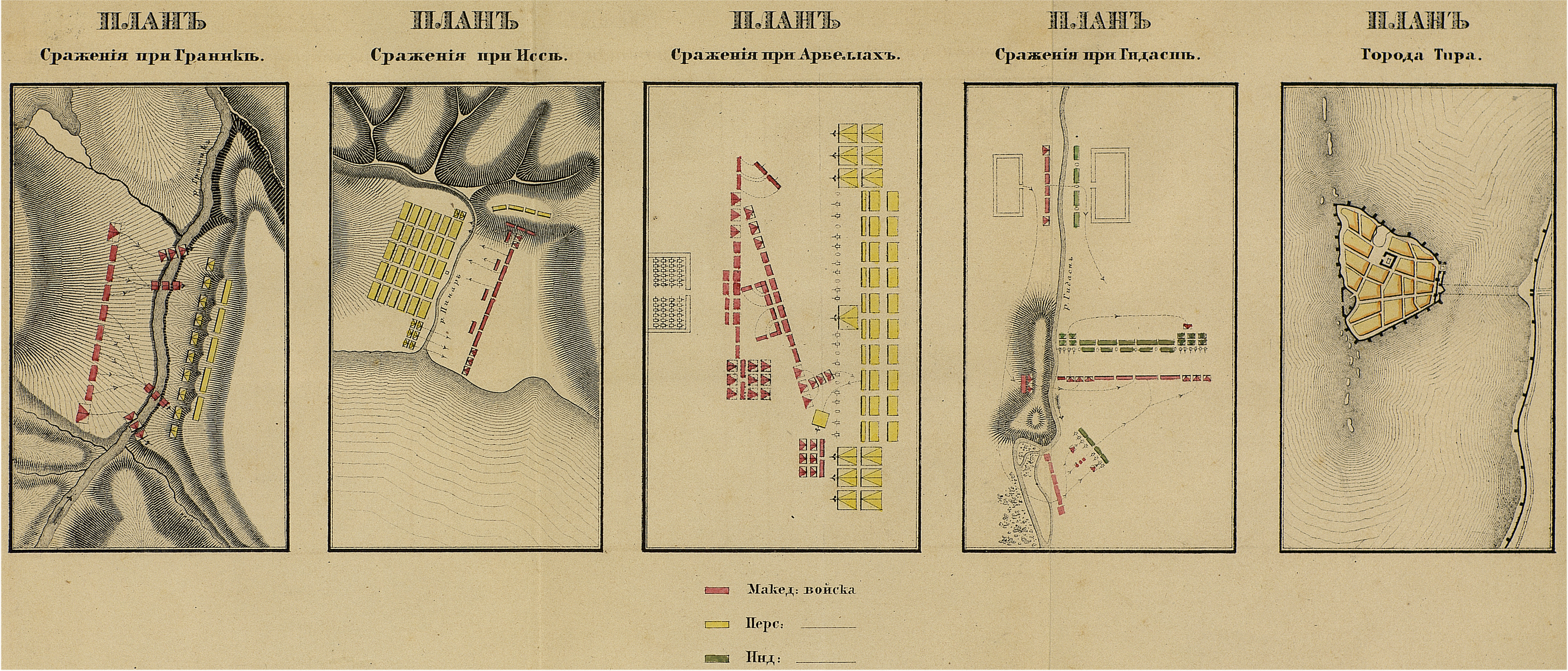Сражения при Граникии, при Иссии, при Арбеллахе, при Гидаспии и план города Тира