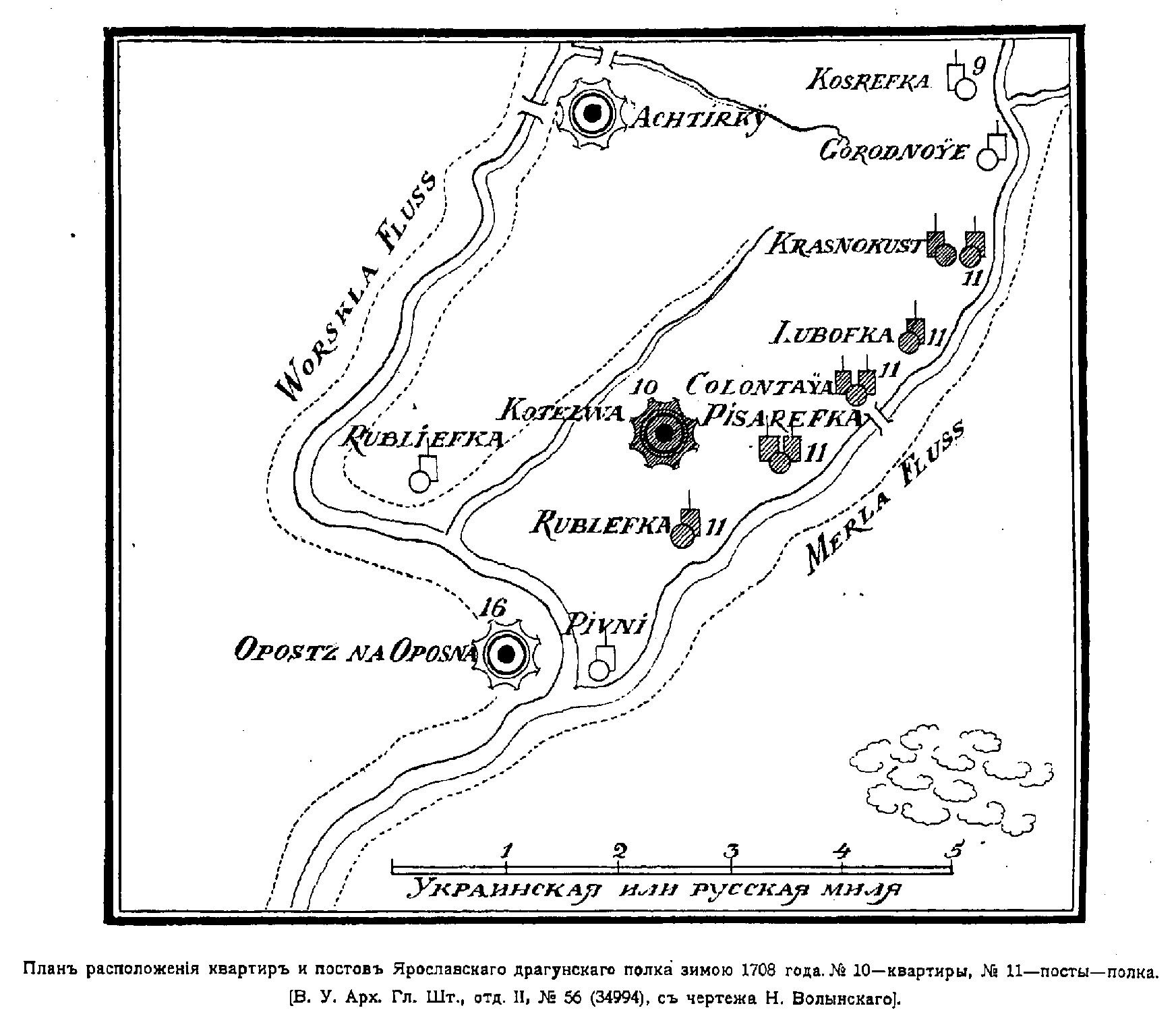 Расположение квартир и постов Ярославского драгунского полка зимой 1708 года. №10 - квартиры, №11 - посты полка. (Военный Ученый Архив Главного Штаба, отд.II, №56, с чертежа Н.Волынского)