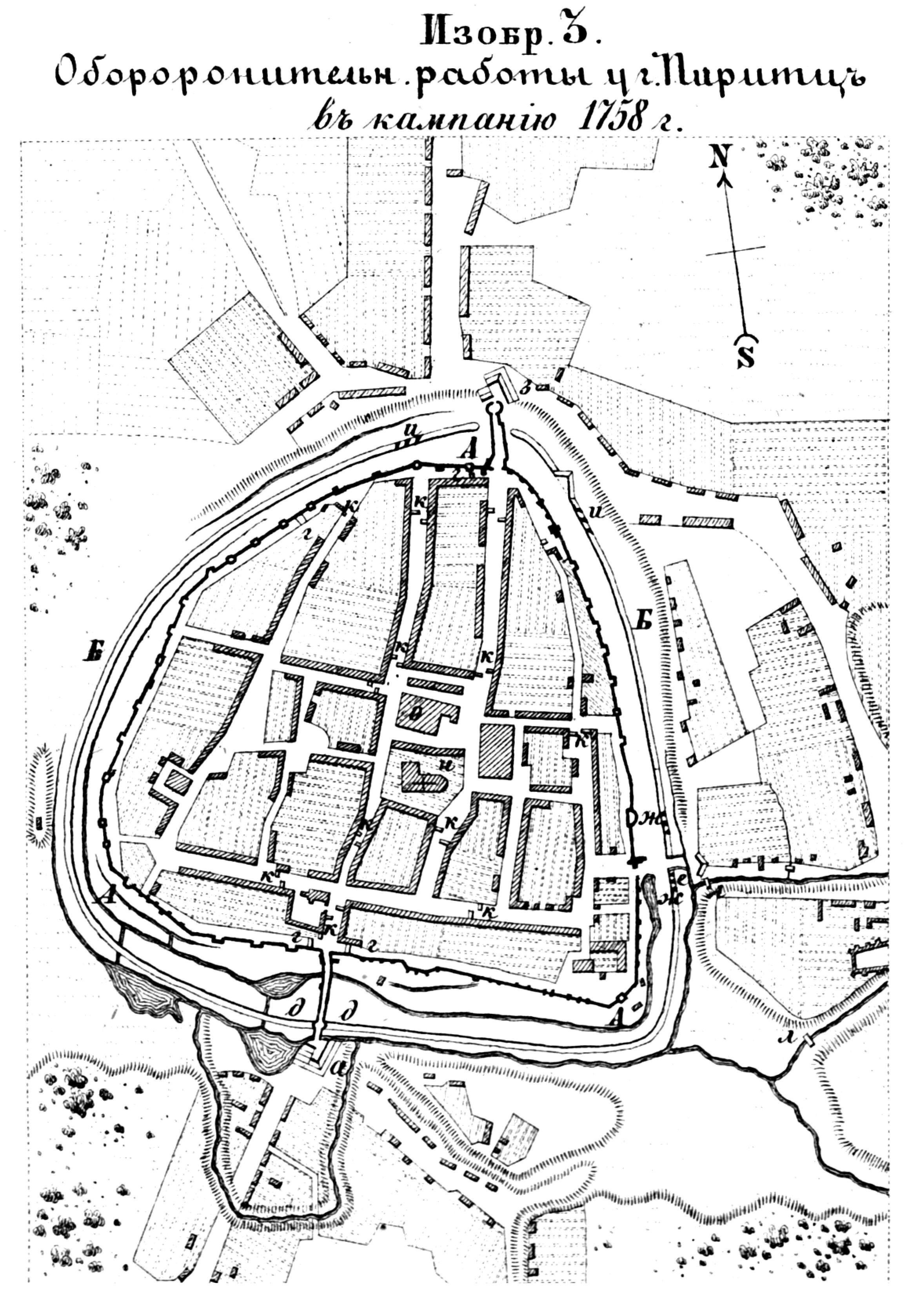 Полевые и временные укрепления. Изобр.3. Оборонительные работы у города Пиритц в кампанию 1758 года