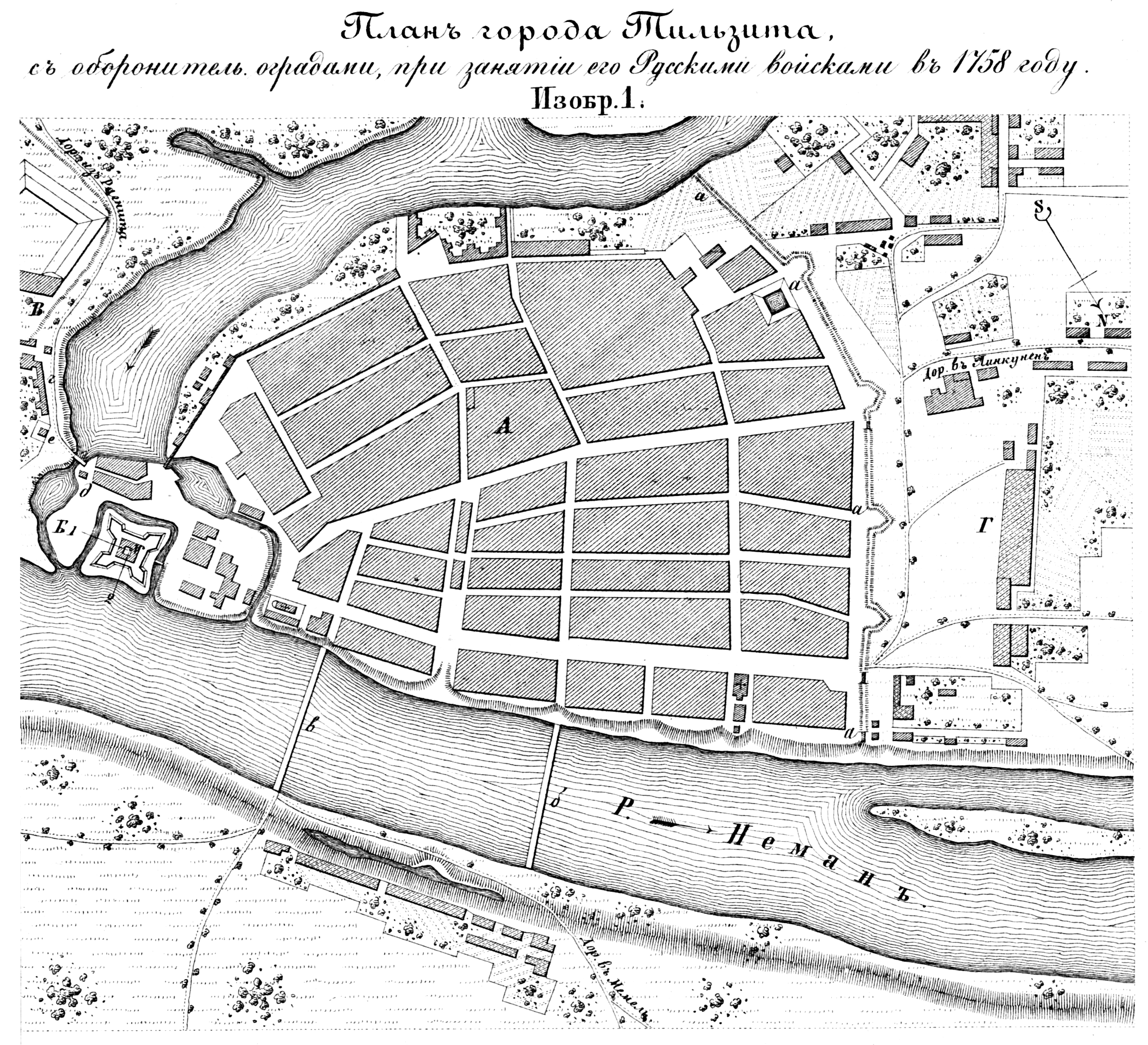 Полевые и временные укрепления. Изобр.1. План города Тильзита с оборонительными оградами, при занятии его русскими войсками в 1758 году