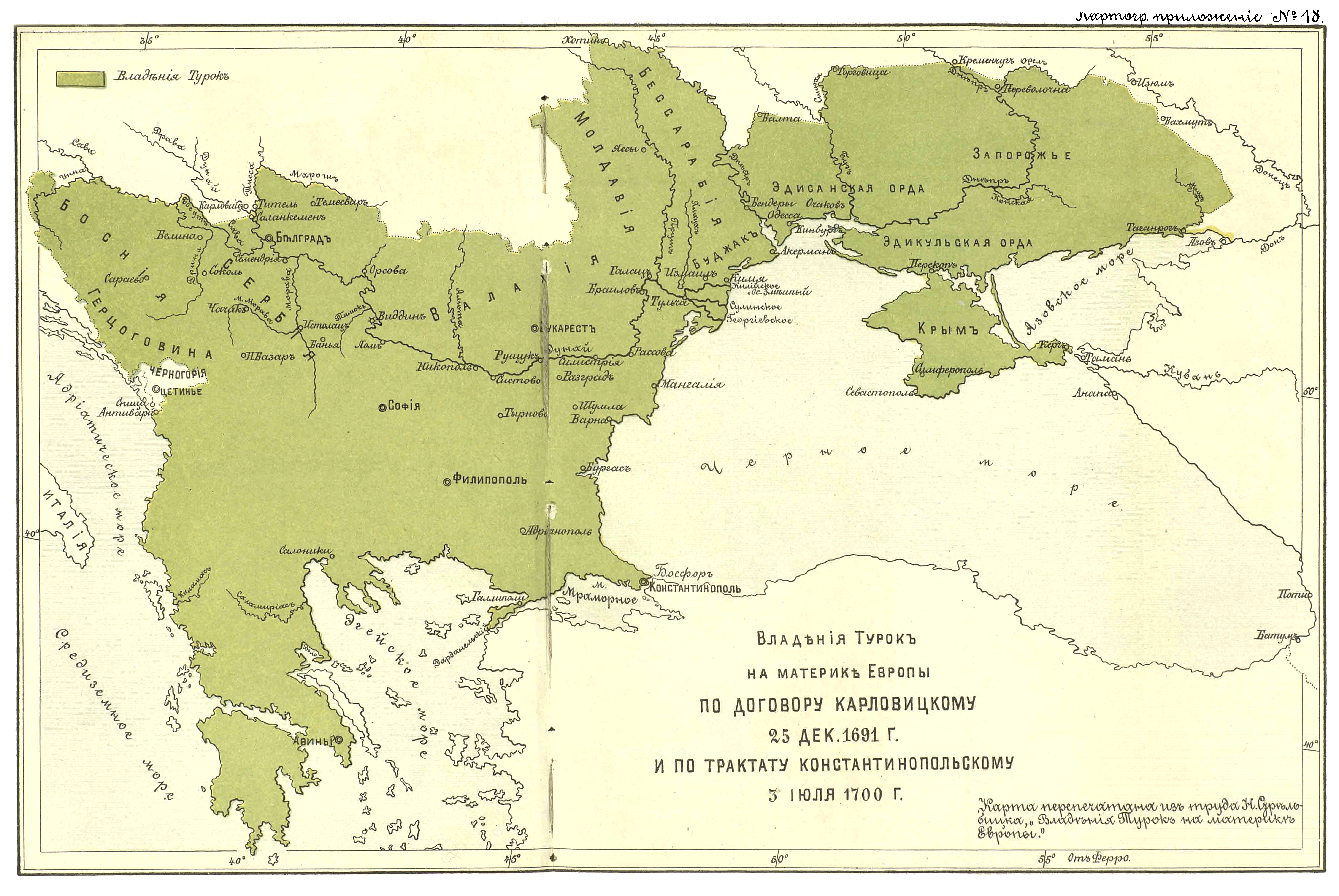 Владения турок на материке Европы по договору Карловицкому 25 декабря 1691 года и по трактату Константинопольскому 3 июля 1700 года