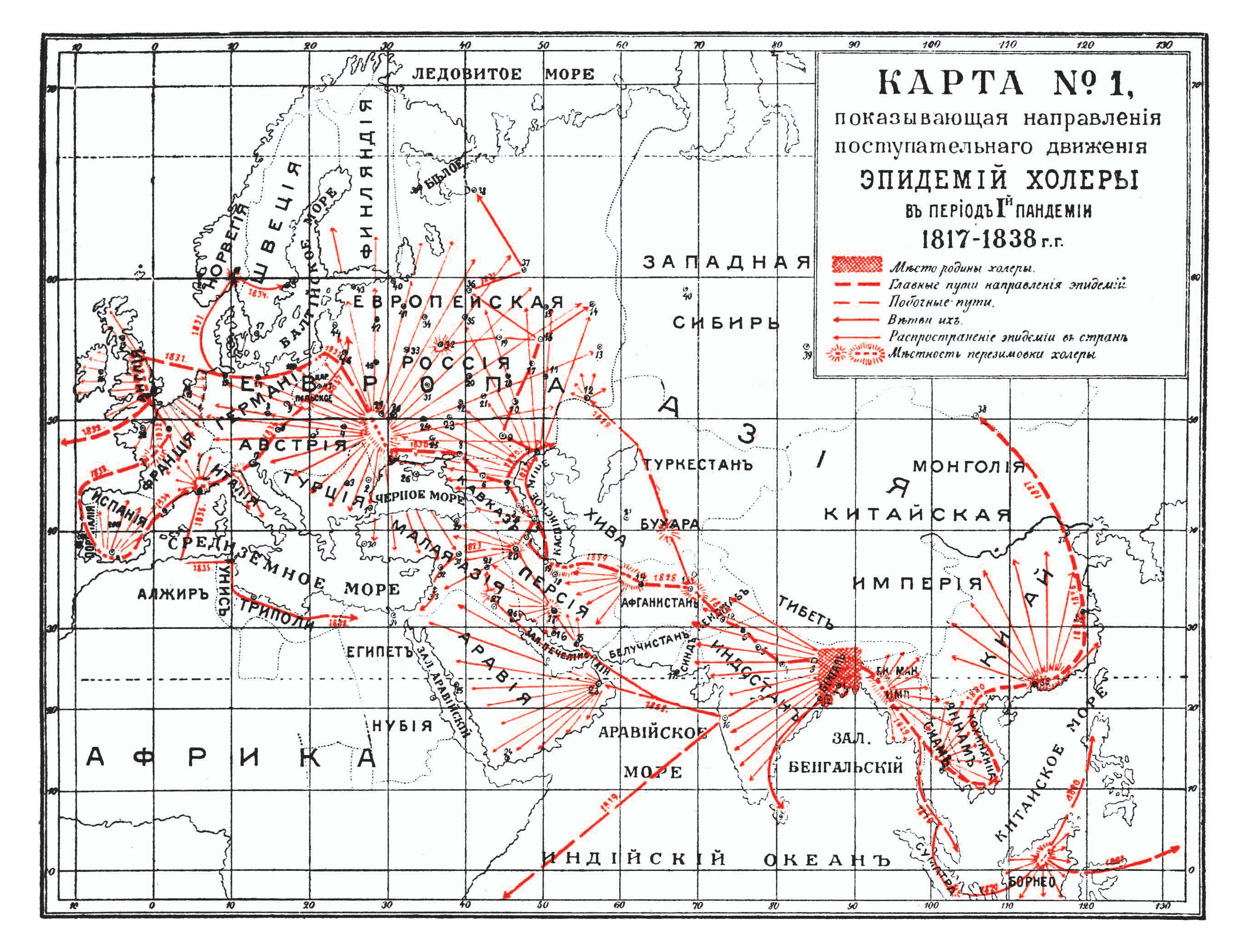 Направления поступательного движения эпидемий холеры в период I пандемии 1817-1838 годов