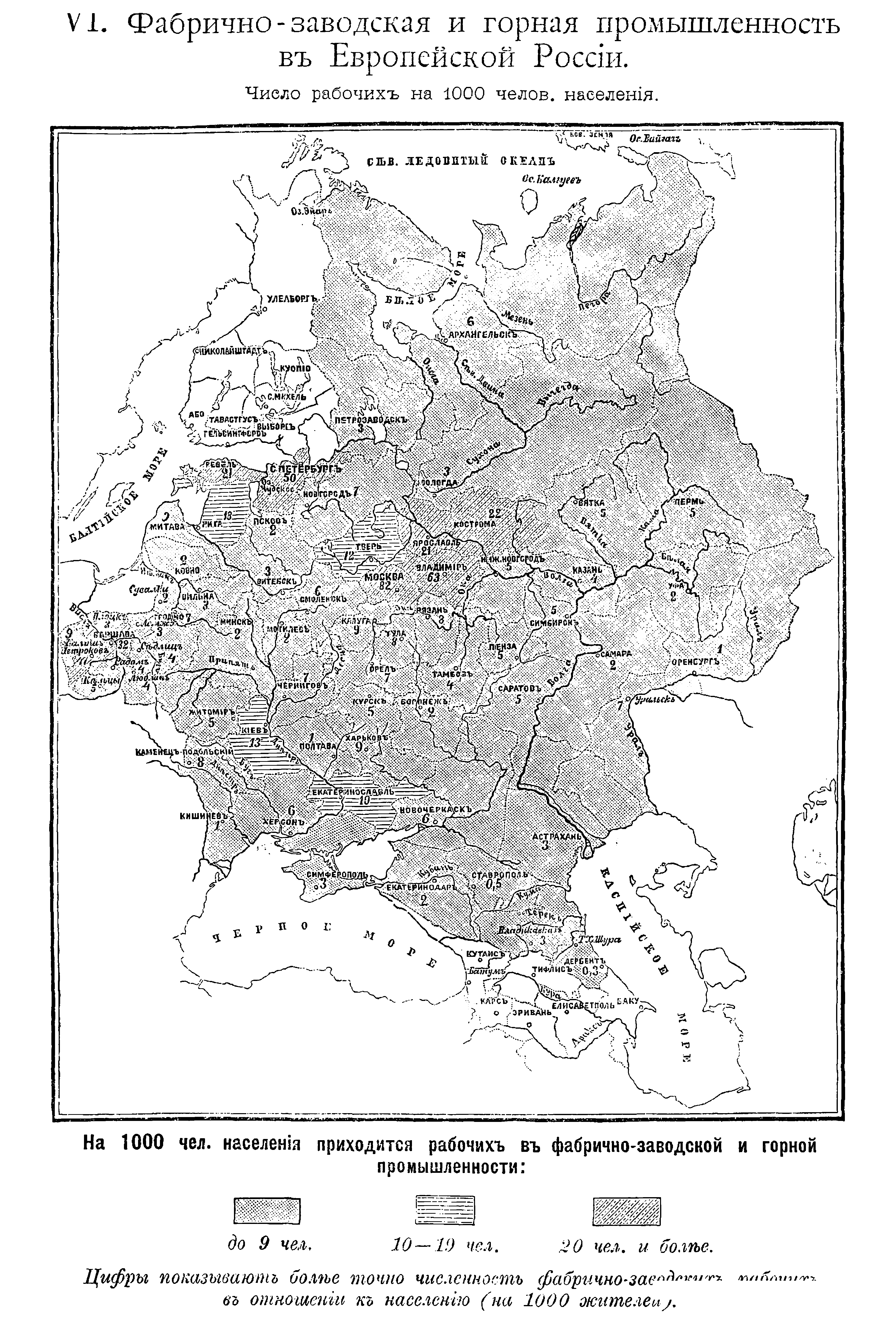 Фабрично-заводская и горная промышленность в Европейской России. Число рабочих на 1000 человек населения